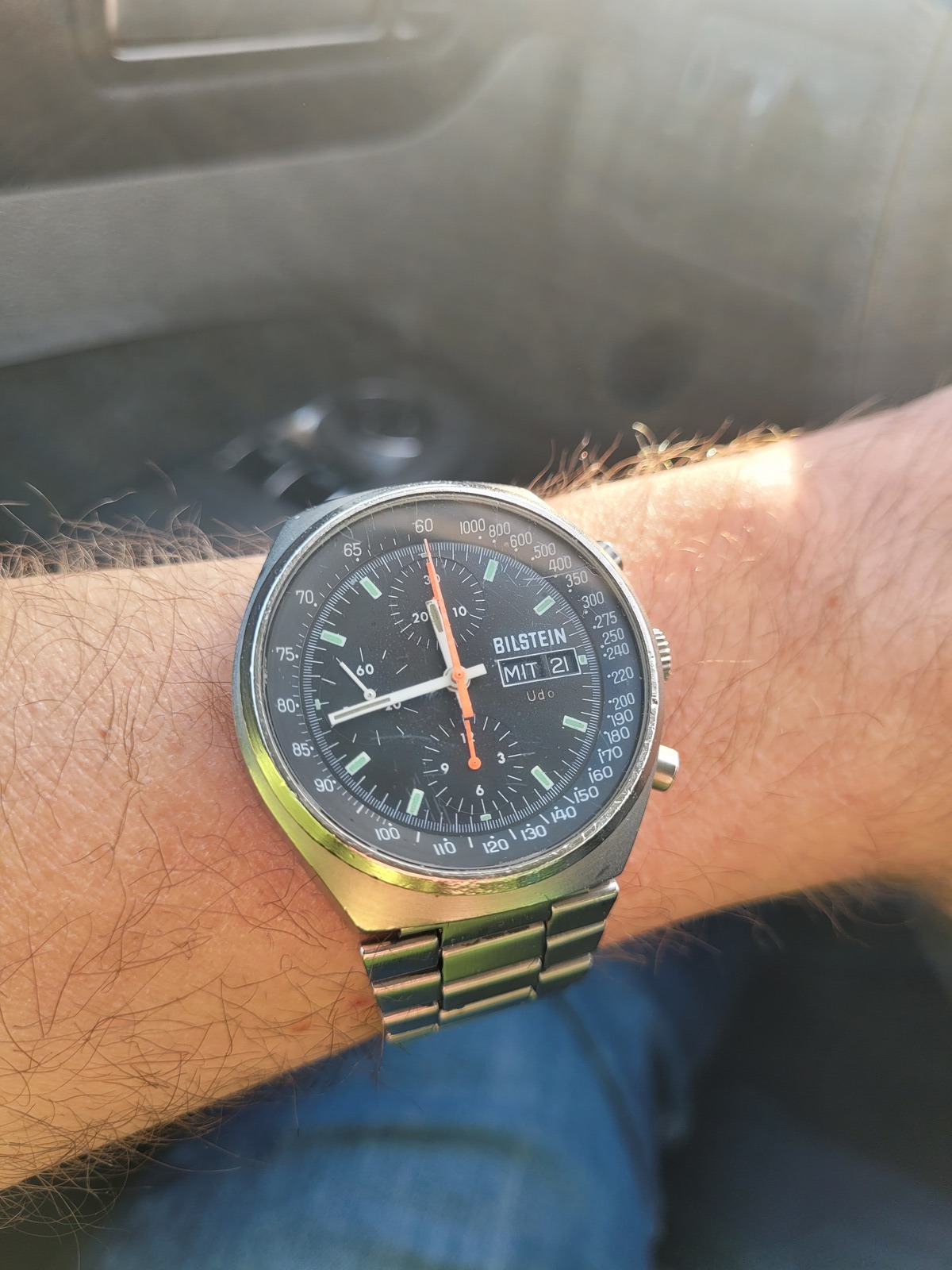 Aktuell habe ich eine Uhr aus der Familie bekommen . Ich halte sie für eine 144 aus den 70er Jahren . Sie trägt den Namen des Autoteileherstellers "Bilstein" auf dem Ziernblatt .Mein Uhrmacher erzählte mir ,dass Herr Sinn seine Uhren auch mit Fremdbezeichnungen verkauft habe .Er selbst habe sie zuvor bei erworben .Bislang wusste ich gar nicht, dass die Wege so verschlungen waren .