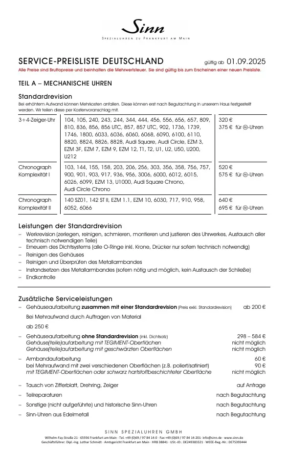 • Sinn Service-Preisliste, Stand:01.09.2025
