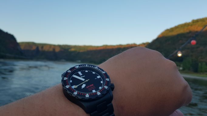 Wenn es nach mir ginge, wäre auch schon die "Neue" mit dabei, aber seit dem großen Stammtisch im April warte ich auf die 13.1... aber es sind ja noch genug andere Uhren da und eine durfte am WE mit auf den Rhein. Wasser ist wenig da aber für eine Fahrt zur Loreley und zurück hat es gereicht.Ich war erstaunt, wie viel Spass das macht und habe viel Erholung mitgenommen.
