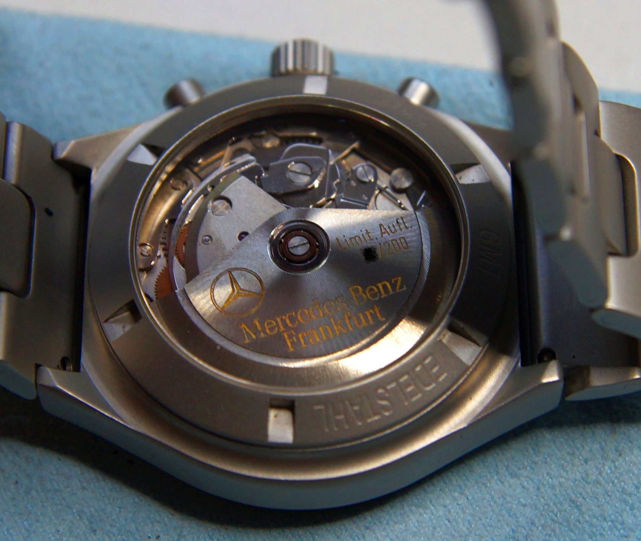 Es handelt sich um eine "normale" 144 St GMT mit Glasboden. Die Uhr wurde für Mercedes Benz mit in Gold gravierter Unruh in Kleinserie zu 200 Stück hergestellt. Die Uhren sind nummeriert. Ausser einem UR-alten google Eintrag habe ich nichts zu der Uhr gefunden....Niemand kauft/verkauft sowas, also null Info.