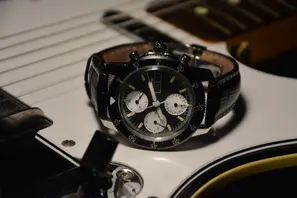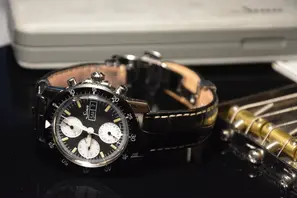Sinn 103A "Panda", ich habe sie noch nicht öffnen lassen, Automatikwerk - Valjoux 7750?, verschraubte Krone, Indizes mit angehender Patina, Seriennummer beginnend mit 103.3xxx, mit "Day/Date", schöner Allgemeinzustand mit wenigen Tragespuren, original Sinn Krokoarmband mit Schmetterlingsschließe. Auftragsarbeit oder Kataloguhr ?, wer vermag dies zu beantworten ;-).