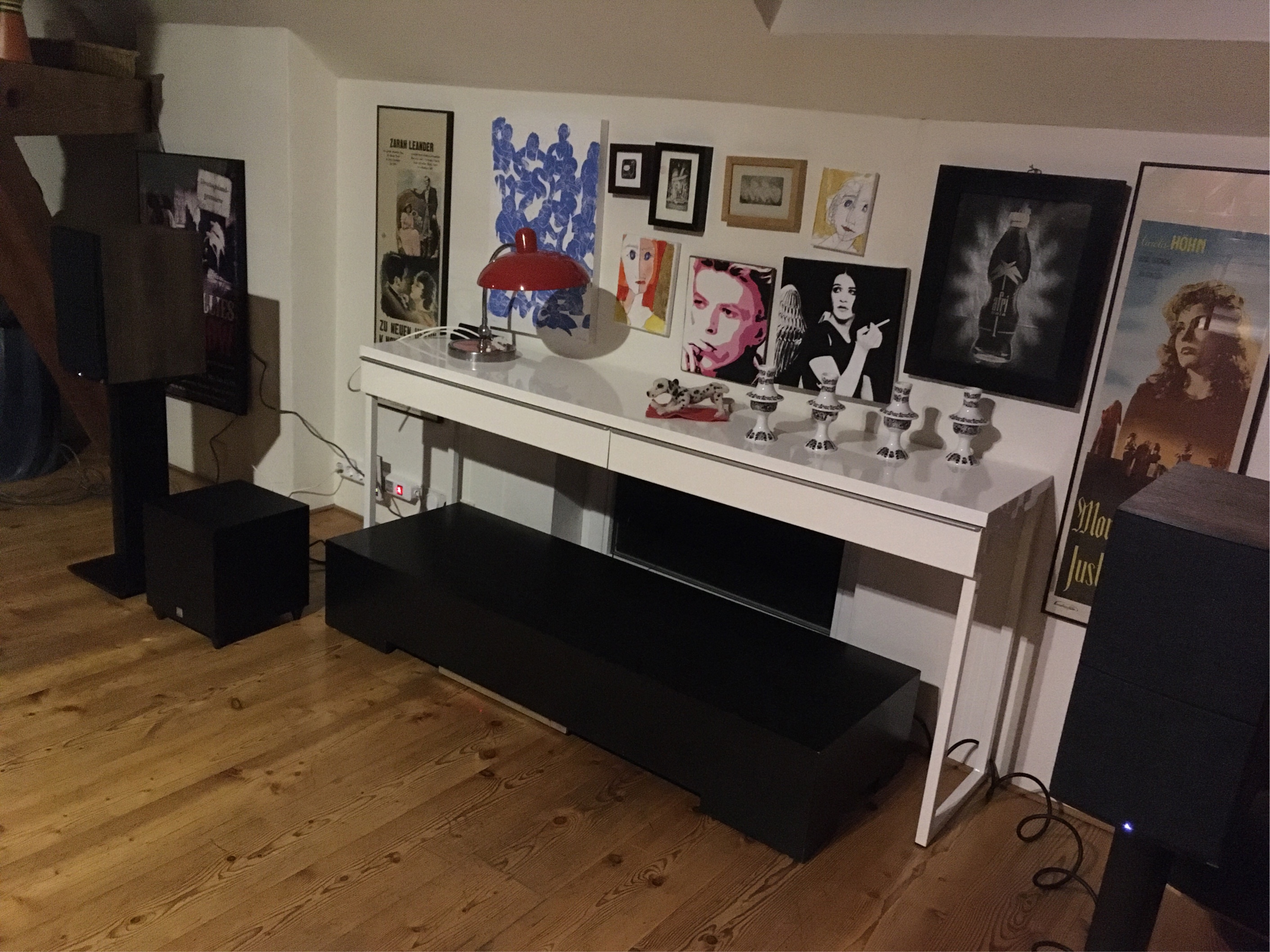 Im Moment versteckt sich die Elektronik (Netzfilter, Streamer und "Sound-Hub") unter dem schwarzen Beistelltisch. Weiß nicht, ob das so bleibt. Aber ich muss sowieso erstmal noch ein bisschen rücken und kucken, bzw. hörcheln, bevor ich mir dann die endgültigen Stellplätze für die Elektrokisten suche. So hat das Ganze dann den maximalen waf...