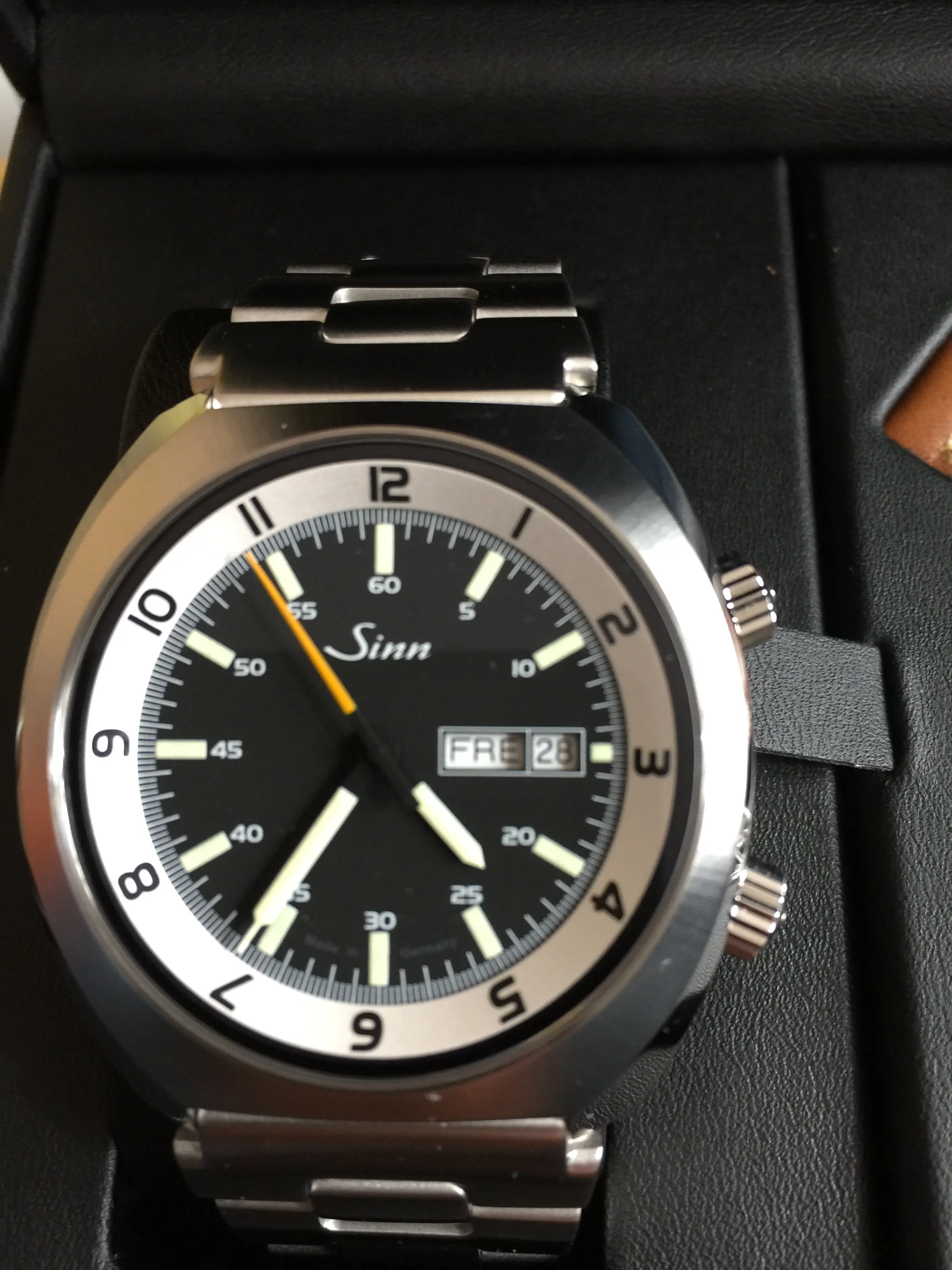 Lieferumfang: Im Etui mit Kalbslederarmband und massivem Edelstahlarmband