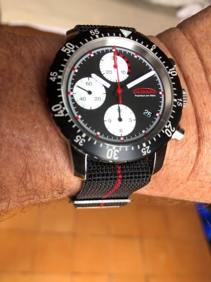 Es geht um die Guinand 155, welche von meiner Frau seit über einem Jahr getragen wird. Zur Uhr in aller Kürze: sehr wertig und makellos verarbeitet (insb. das Zifferblatt, Indizes und die Zeiger), sensationelle Gangwerte, kein Aussetzer in keine Richtung, sehr gutes Preis-Leistungsverhältnis und für den schlanken Damenarm als Chronograph noch tragbar.