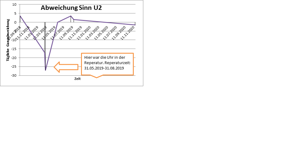 Interessant ist, daß Deine U2 auch plötzlich richtig nachging, die einzige andere U2, die ich kenne, war die eines ehemaligen Kollegen. Diese war ebenfalls nach nur 3 Monaten zur Revi, dies hat 2 Wochen gedauert und dann hatte er die Uhr wieder.