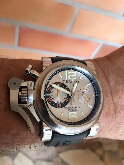 Graham Chronofighter Oversize Ranger gentlemans watch, Stainless steel bezel. Silver colored dial with 2 sub-dials. Luminous hour markers and hour, minute hands. Stainless steel crown and pushers. Automatic C.O.S.C. movement. Rubber strap with stainless steel pin buckle. Hours, minutes, seconds and chronograph. Water resistant up to 100 meters / 330 feet.Gekauft am 23.12.2015
