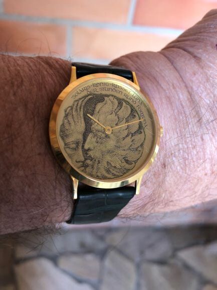 "KUNST AM HANDGELENK", WERK VON PROF. ERNST FUCHS WIEN, 18K GOLD, ZIFFERBLATT 18K GOLD, GOLDSCHLIESSE, SAPHIRGLAS,