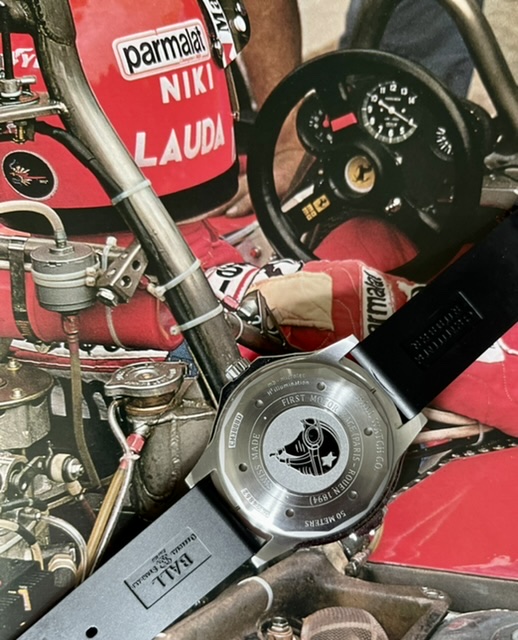 Zitat Ball: „Das Slide-Chronograph-System beinhaltet eine runde, um das Uhrwerk herum angeordnete Gleitschiene. Der Chronograph wird durch Drehen der Gleitschiene im Uhrzeigersinn aktiviert und deaktiviert und rückgestellt.“