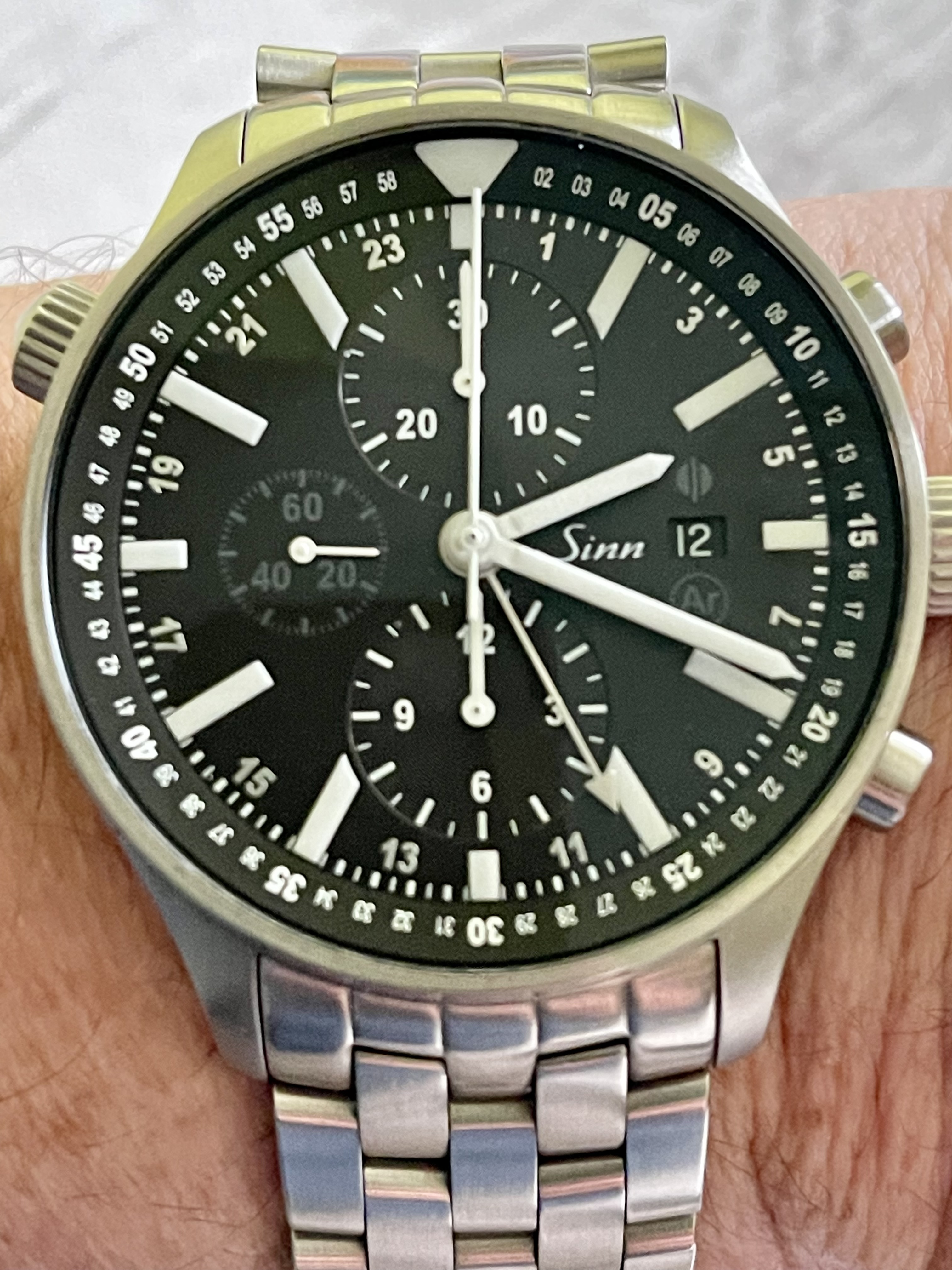 Internet, aber dass ist ja bei allen Sinn Uhren so. Das Chronissimo Lederband ist zwar schön und läßt sich angenehm tragen, aber das Feingliederband musste ich unbedingt dazu haben weil es die Uhr optisch noch mal um einiges aufwertet und man auch mal damit ins Wasser kann ohne die Fliegeruhr mit meiner U1 zu tauschen da 200 Meter wasserdicht.