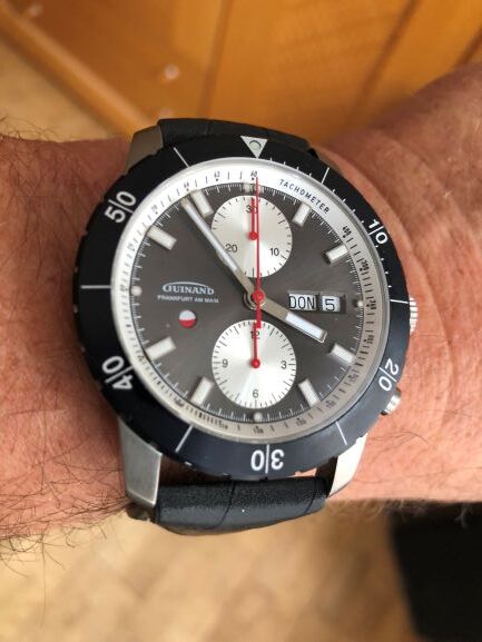 den DuoIndikator habe ich schon seit Jahren. Aus meiner Sicht eine der interessantesten Uhren von Guinand. Sie hat zwar das dunkelgraue Zifferblatt und ein Silikonband, allerdings war auch damals schon ein passendes Metallband verfügbar. Die blaue Ausführung sieht gut aus, aber ich sehe keinen Grund für mich, deshalb zu wechseln.