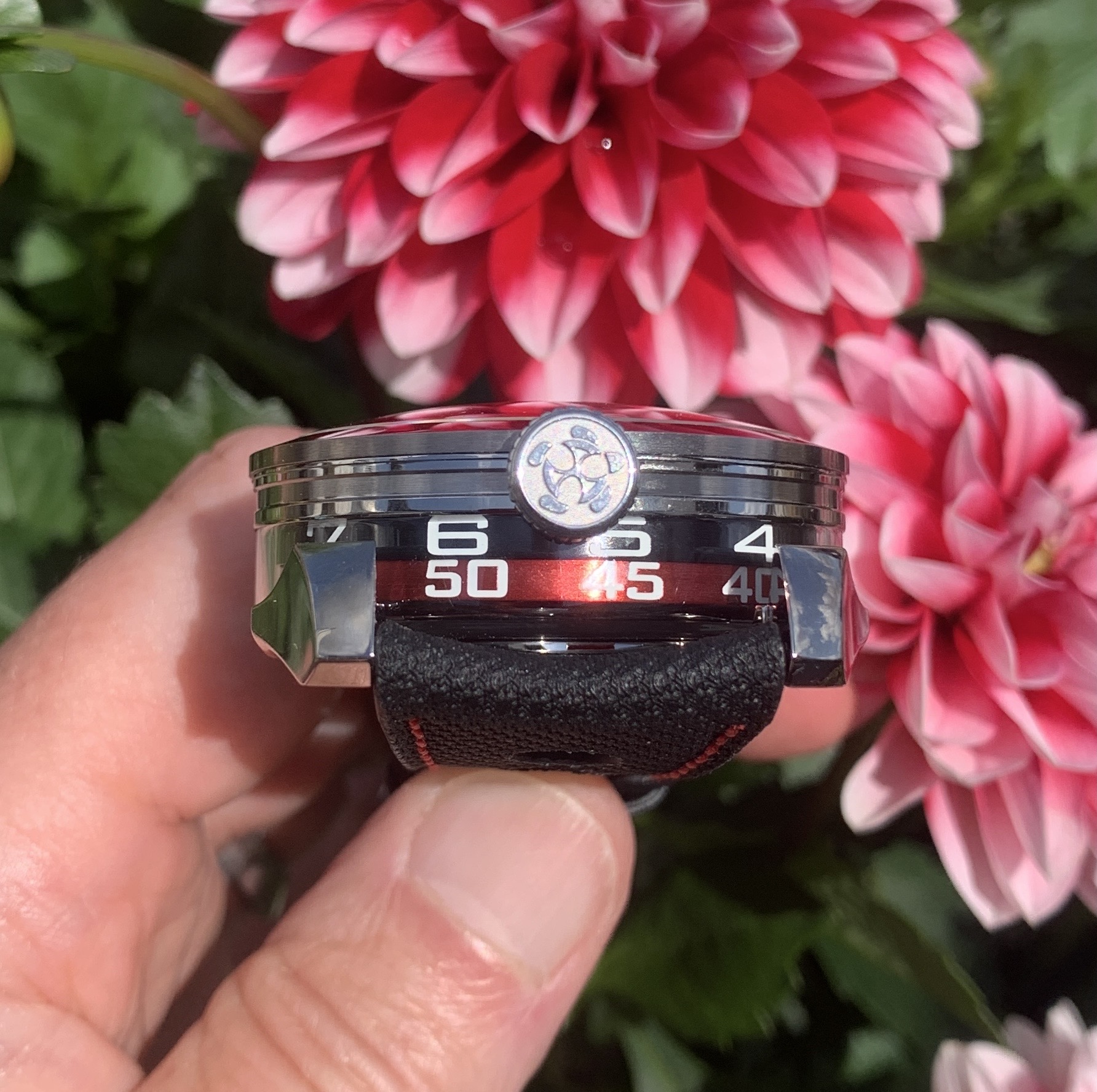 Das Werk steht auf dazu dem Kopf – was aber egal ist, da die Uhr nicht über Zeiger, sondern über eine semidigitale Anzeige auf der Gehäuseseite verfügt.