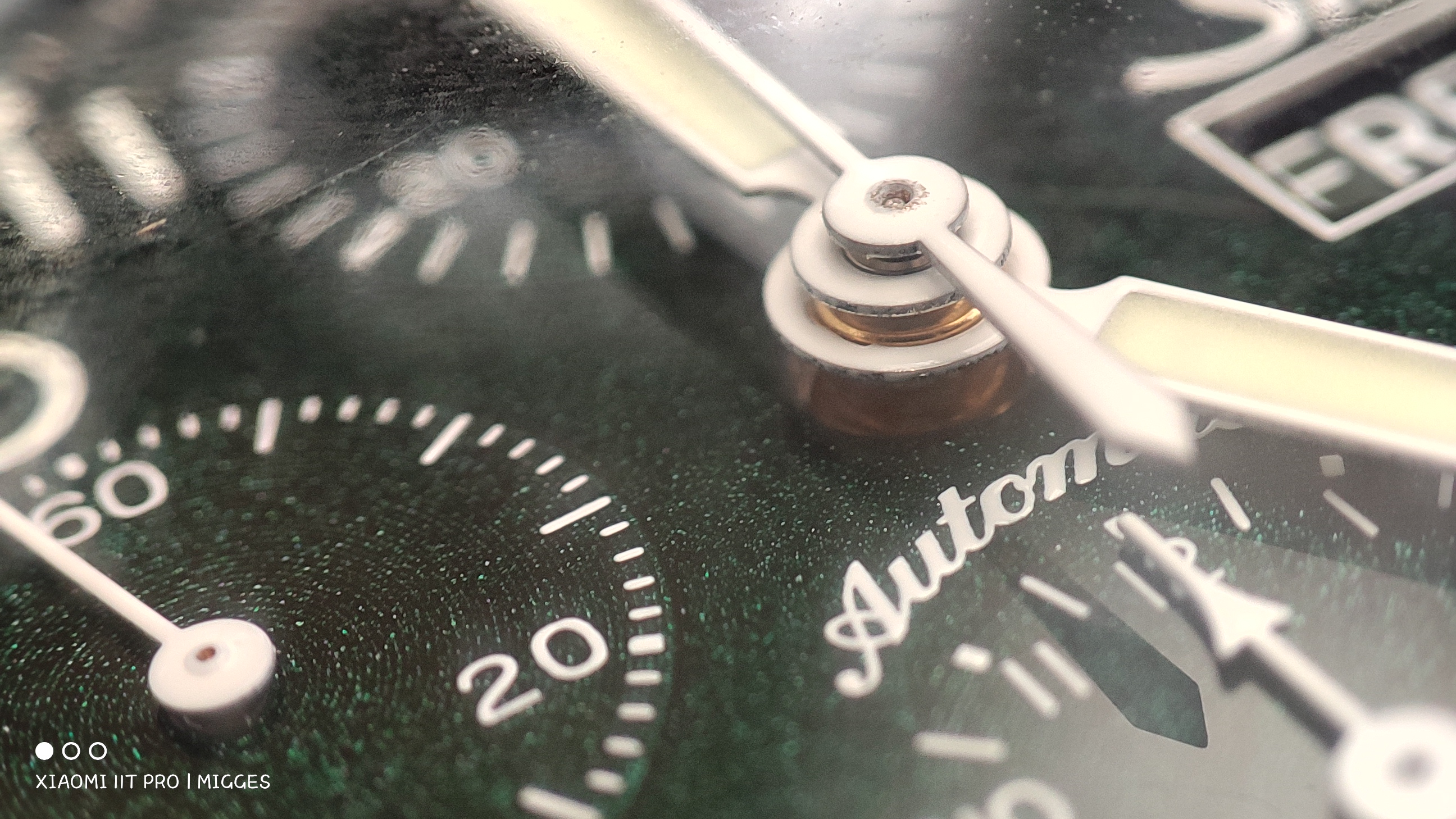 Stunden-, Minuten- und Stoppsekundenzeiger mit Leuchtfarbe belegt