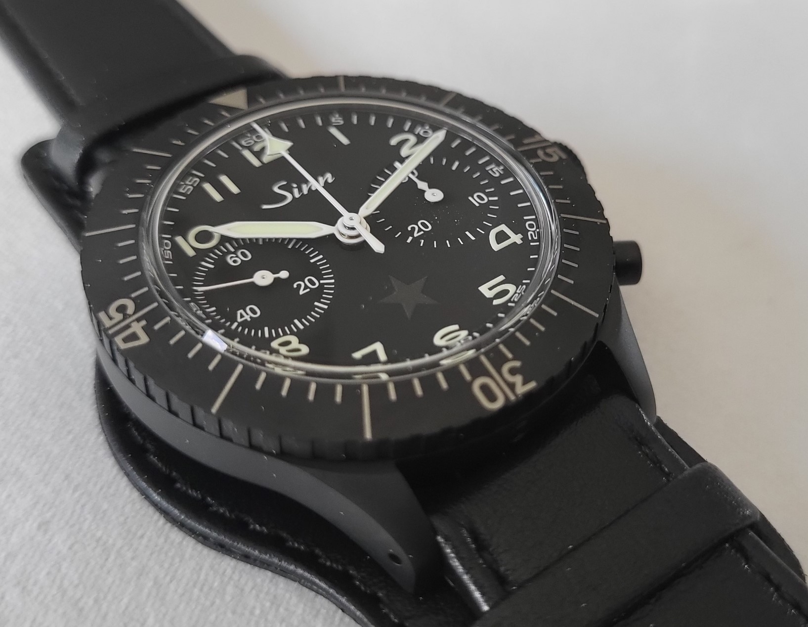 Völlig neu ist allerdings, dass das Gehäuse und der Fliegerdrehring mit den SINN-Technologien TEGIMENT und schwarzer Hartstoffbeschichtung ausgestattet sind.