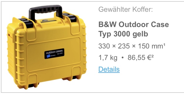 • Ich bringe noch einen B&W Outdoorcase Typ 3000 in gelb mit individuellem konfiguriertem, festen Schaumstoff