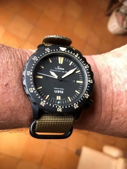 Den blauen Punkt gab es auch schon Jahre vorher auf dem Zifferblatt bei 6 Uhr. Sinn Taucheruhr U212 SE aus U-Boot-Stahl aus dem Jahr 2015, limitiert auf 300 Exemplare.