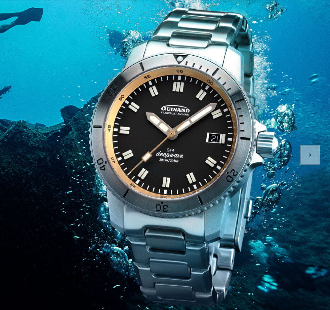 Mit der Lancierung der deepwave 2023 hat sich Guinand vom reinen Flieger- und Instrumentenuhrenbauer in das Feld der Sport- und Taucheruhren vorgewagt. Schon längere Zeit hatten sich das die Fans der Marke gewünscht aber so ein Projekt ist mal eben nicht so schnell realisiert und will wohl durchdacht sein. Umso größer war die Freude und Begeisterung allerseits, als Guinand die neue Serie G44 deepwave erstmalig auf der watchtime im Oktober 2023 in Düsseldorf präsentierte. Wer sich nicht mehr erinnert, die Uhr wurde als eyecatcher in einem blau ausgeleuchteten Tauchbecken präsentiert und als giveaway wurden kleine, blaue, wasserdichte Seesäcke mit Guinand und G44 deepwave Logo verteilt. Die Uhr mit Wadi 300m und der eigenständigen Optik kam in der Uhrengemeinde gleich gut an, zumal es gleich auch mehrere Varianten gab. Gehäusefinish satiniert oder perlgestrahlt nach Wahl und eine kleine F.A.Z Sonderedition von nur 50 Stück in polierter Ausführung mit blauem Blatt und Edelstahllünette, diese ist aktuell noch über den FAZ Shop erhältlich.
