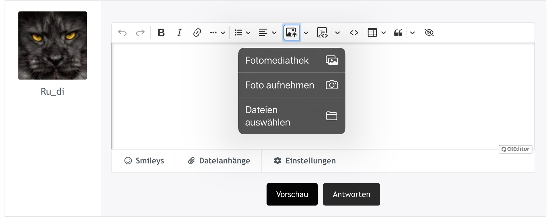 Ich habe gerade ein Foto hochgeladen, indem ich ich es direkt aus dem Forum geknipst habe - super.