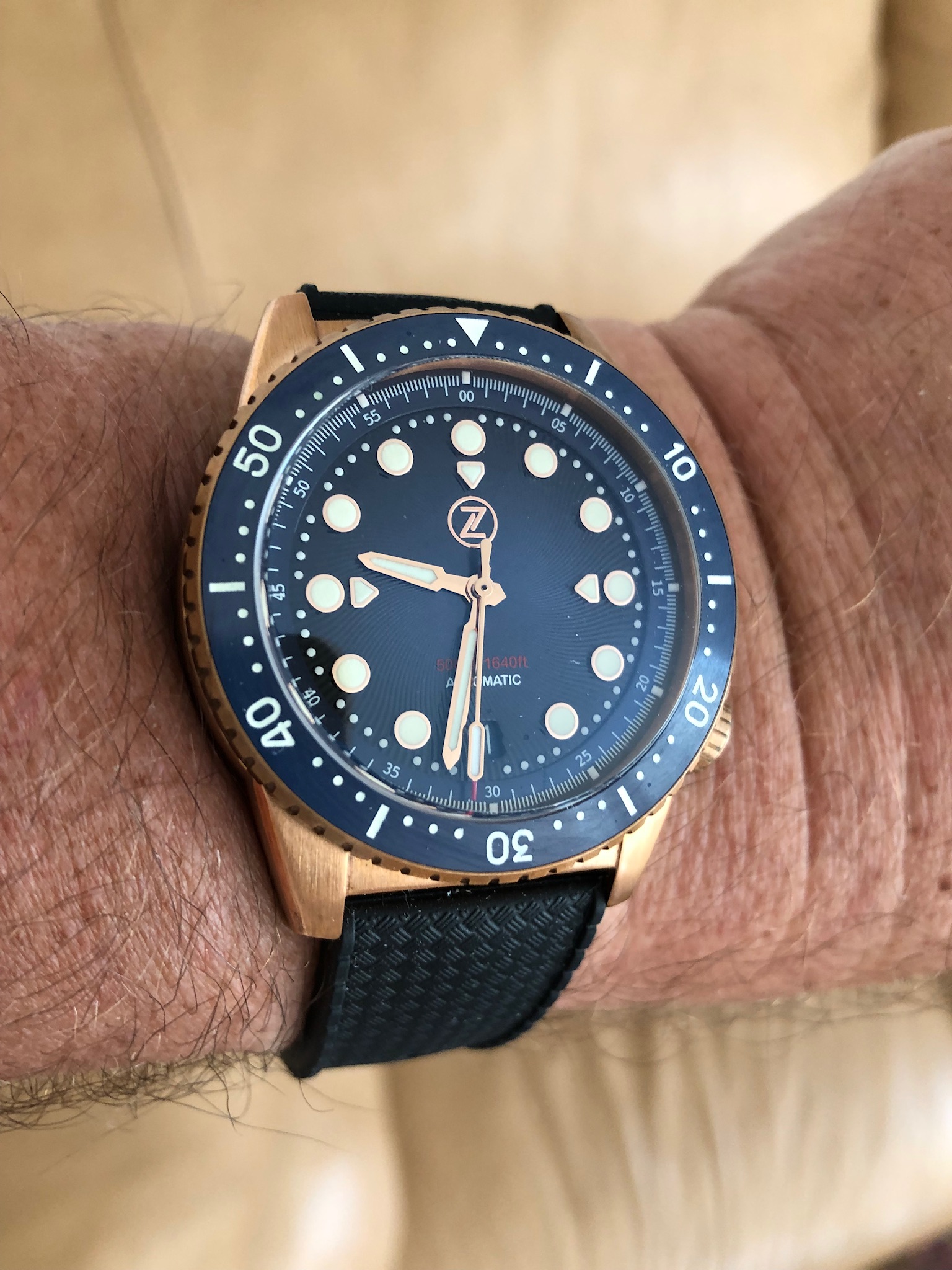 Hier die ZELOS V2 MAKO 500 BRONZE von Serious Watches/NL, zunächst mit Original Kautschuk Band, dann mit Erika Strap, welches ich zeitgleich bestellt hatte. -