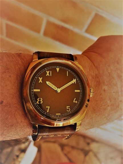 The ANCON Military MIL106 is a gorgeous watch with a very cool classic army design. Under the hood you´ll find a reliable, high quality, automatic Japanese Miyota 90S5 28800bph movement. The watch is finely finished and the Italian leather strap is very comfortable and beautiful. The glass is domed mineral glass, which matches the design. The most obvious perk of the watch is the material: it's entirely made from CuSn8 bronze. Bronze has the great attribute that it builds up a layer of patina. This is an ongoing process which makes every watch unique. Discolouration is normal with this material. One major benefit is that you can largely bring back your watch in the original condition by using a Cape Cod cloth.