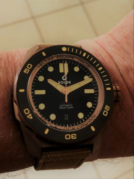 The BOLDR Odyssey Bronze SW Edition II is a great diving watch with a powerful, original design. It has a lot of great features such as 500m water resistance, a Helium Escape Valve, domed sapphire glass with an AR coating, Old Radium lume (which is not radioactive!) and a 120-click unidirectional bezel with a ceramic insert. Under the hood you'll find a Japanese SII NH35 movement. The 45.5mm (53mm lug to lug) case is made from CuSn8 bronze. Bronze has the great attribute that it builds up a layer of patina. This is an ongoing process which makes every watch unique. Discolouration is normal with this material. One major benefit is that you can largely bring back your watch in the original condition by using a Cape Cod cloth. The dial is a sophisticated black colour, with a nice shine to it. It is matched to a stylish and comfortable, black, Horween leather strap.