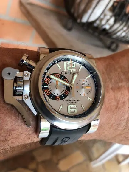 Graham Chronofighter Oversize Ranger gent’s watch, Model # 2OVAS.S02A.K10B. Stainless steel 47mm case. Stainless steel bezel. Silver colored dial with 2 sub-dials. Luminous hour markers and hour, minute hands. Stainless steel crown and pushers. Automatic C.O.S.C. movement. Rubber strap with stainless steel pin buckle. Hours, minutes, seconds and chronograph. Water resistant up to 100 meters / 330 feet.Bought on December 23, 2015