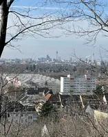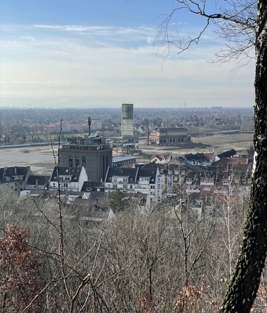 Vorne der graue ehemalige Bunker - heute Wohnungen -