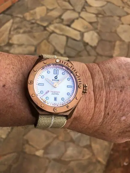 The BOLDR Odyssey Bronze SW Edition is a great diving watch with a powerful, original design. It has a lot of great features such as 500m water resistance, a Helium Escape Valve, domed sapphire glass with an AR coating, BGW9 lume and a 120-click unidirectional bezel. Under the hood you'll find a Japanese SII NH35A movement. The 45.5mm (53mm lug to lug) case is made from CuSn8 bronze. Bronze has the great attribute that it builds up a layer of patina. This is an ongoing process which makes every watch unique. Discolouration is normal with this material. One major benefit is that you can largely bring back your watch in the original condition by using a Cape Cod cloth. The dial has a lovely texture and a sophisticated silver/white colour, that plays very well with the light.