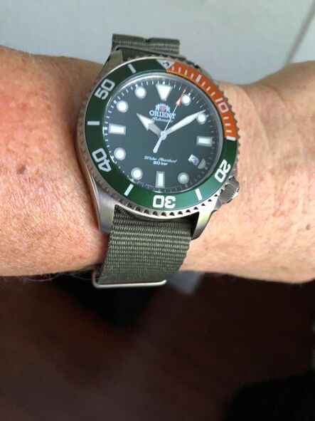 The Orient RA-AC0K04E is an awesome diving watch with an in-house, Made in Japan, Orient Cal. F6922 automatic movement. While it's not a small watch, it is still comfortable due to the crown at 4 o'clock and is still suitable for most outfits and occasions. You can wear the watch during swimming with its 200m water resistance (although it's not suited for air diving), but it will also look great with a suit or casual wear. It's a true no-nonsense watch with a solid design, great quality and a true mechanical in-house movement that also features sapphire crystal. The case has a durable bronze-coloured PVD coating, with matching hardware on the nato strap.