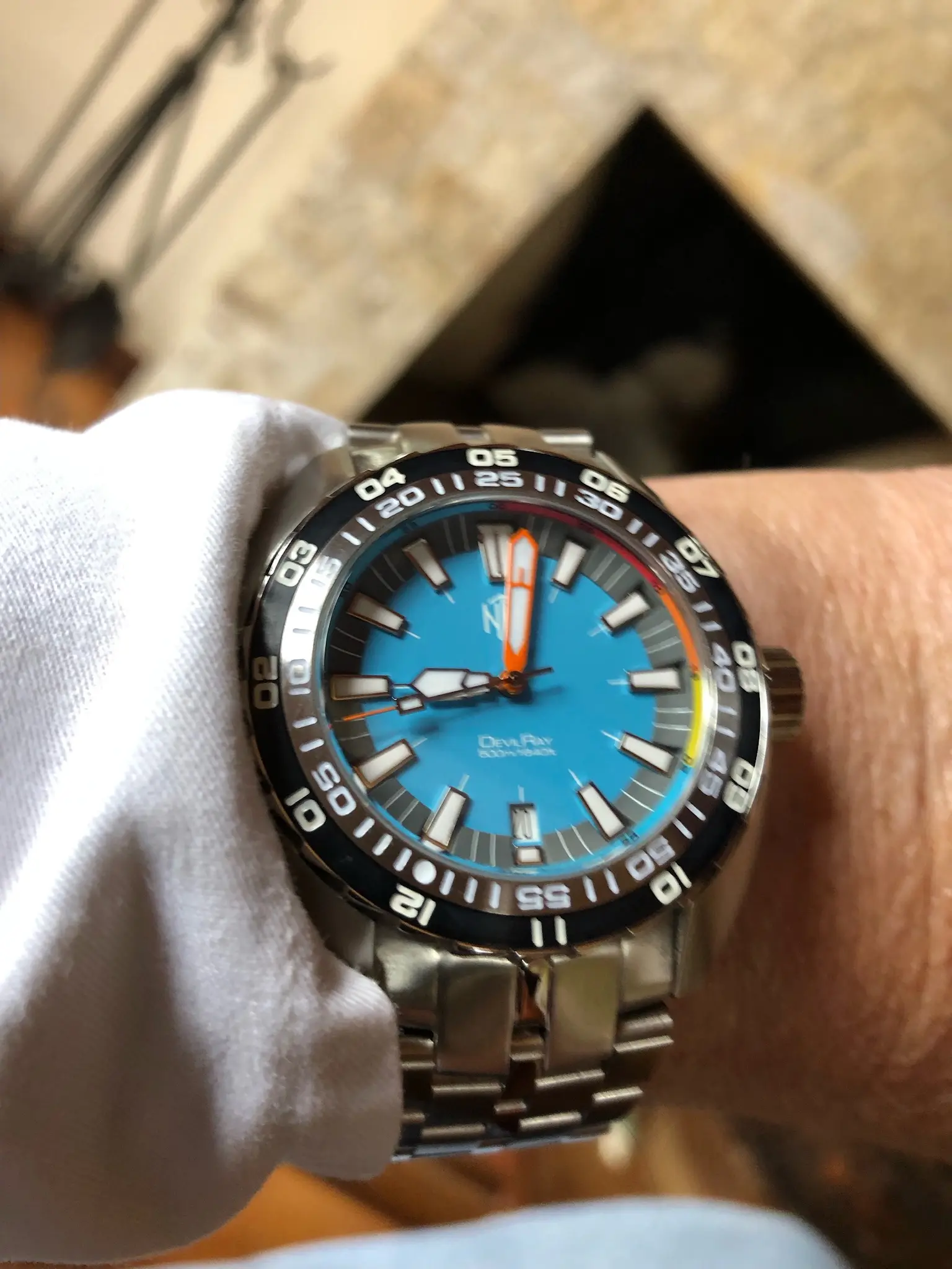 The NTH DevilRay Turquoise Date is a superb diving watch. The technical aspects are very impressive: double domed sapphire glass with an AR coating, 500m (50ATM) water resistance, bright X1 Superluminova, 120 click uni-directional bezel with a DLC insert and of course a great Swiss Made automatic movement, the Swiss Tech Prod. cal. STP1-11 auto (28800bph). The watch is very comfortable with the 'just right' 43mm diameter (46mm lug to lug) but also due to the great clasp with divers extension.