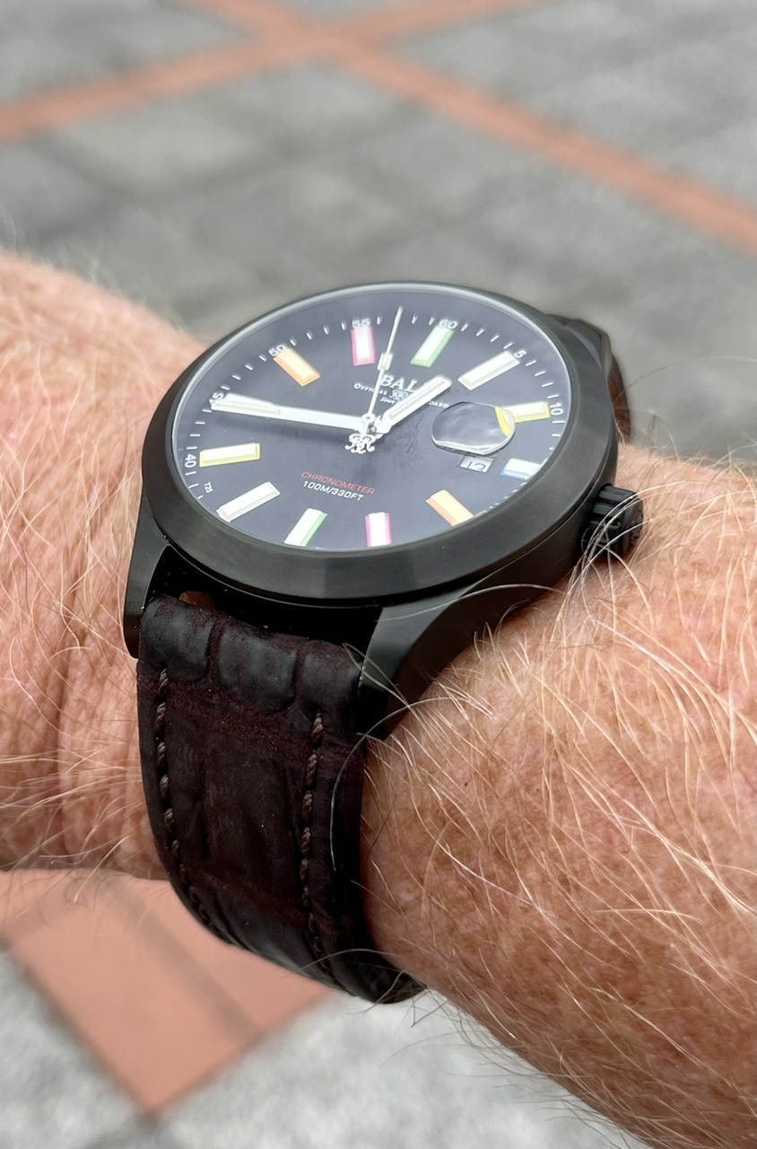 Mir gefällt auch der Kontrast von Uhr und Lederband (schwarz/braun). Das Lederband gefällt mir ohnehin sehr gut, hier insbesondere nochmal mit dem EZM-Emblem. Ich habe dieses Band in der Vintage-Optik in schwarz-rot für meine 103. Es ist sehr weich und trägt sich sehr angenehm. Ist das bei der 22mm-Ausführung auch so?