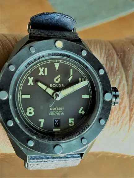 The BOLDR Odyssey Cali Umber is a great diving watch with a powerful, original design. It has a lot of great features such as 500m water resistance, a Helium Escape Valve, domed sapphire glass with an AR coating, and a 120-click unidirectional bezel. Under the hood you'll find a Swiss Made Sellita SW200-1 movement.