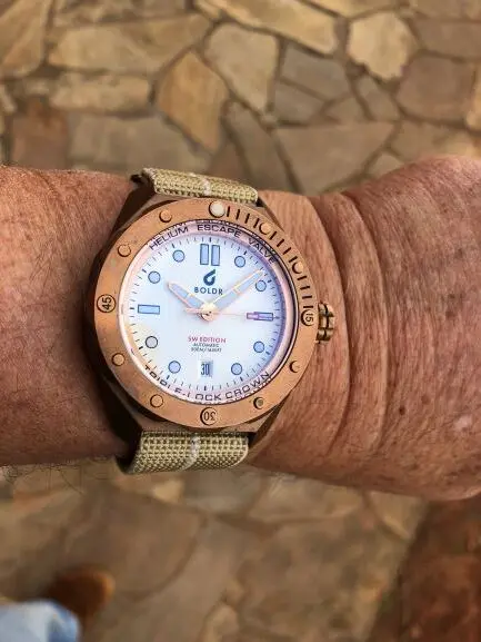 The BOLDR Odyssey Bronze SW Edition is a great diving watch with a powerful, original design. It has a lot of great features such as 500m water resistance, a Helium Escape Valve, domed sapphire glass with an AR coating, BGW9 lume and a 120-click unidirectional bezel. Under the hood you'll find a Japanese SII NH35A movement. The 45.5mm (53mm lug to lug) case is made from CuSn8 bronze. Bronze has the great attribute that it builds up a layer of patina. This is an ongoing process which makes every watch unique. Discolouration is normal with this material. One major benefit is that you can largely bring back your watch in the original condition by using a Cape Cod cloth. The dial has a lovely texture and a sophisticated silver/white colour, that plays very well with the light.