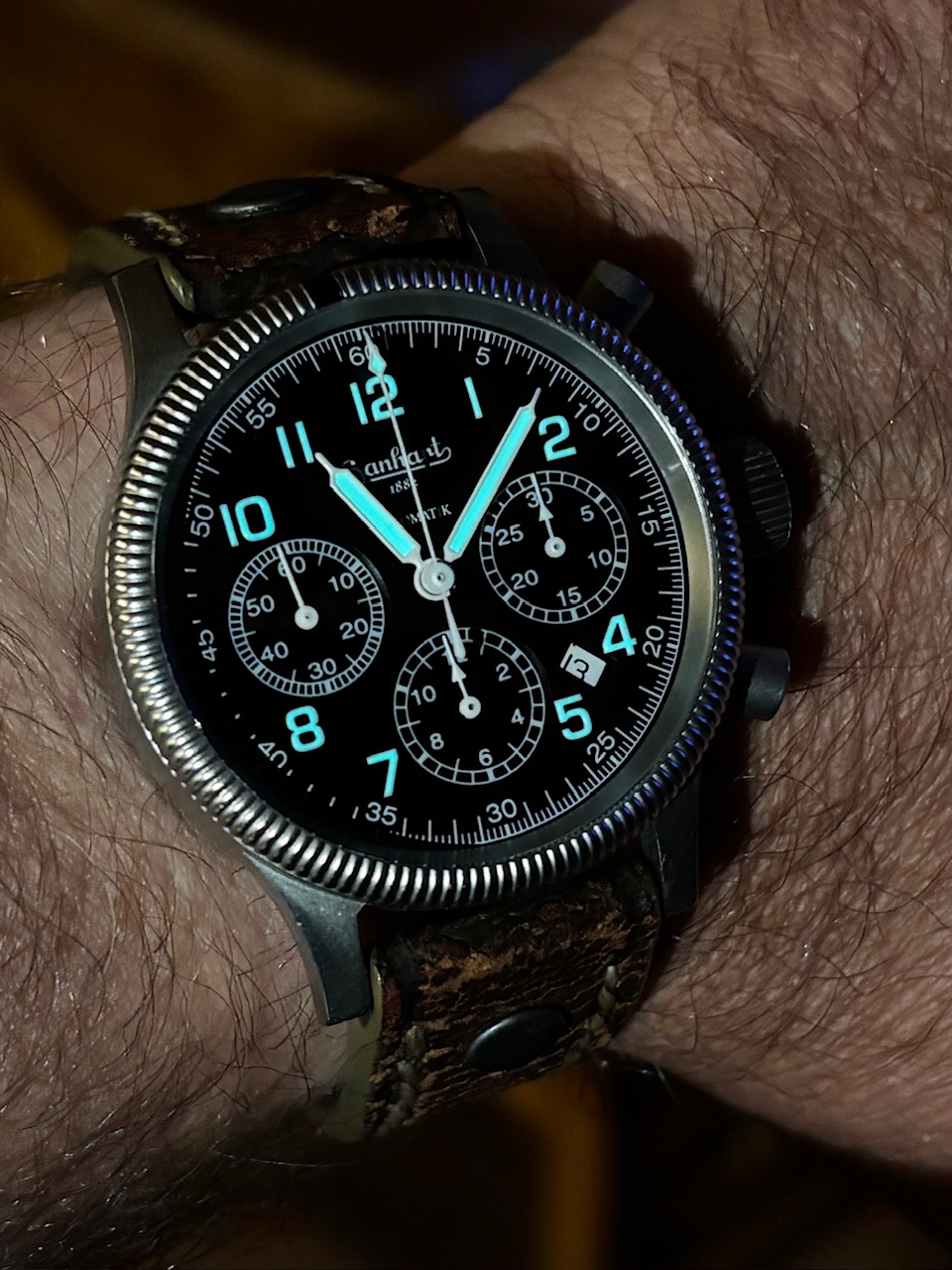 heute mal ne Uhr mit einem tollen Manufakturwerk, Flyback, Titangehäuse, Carbonlünette, Schnellwechselbandsystem und Glasboden
