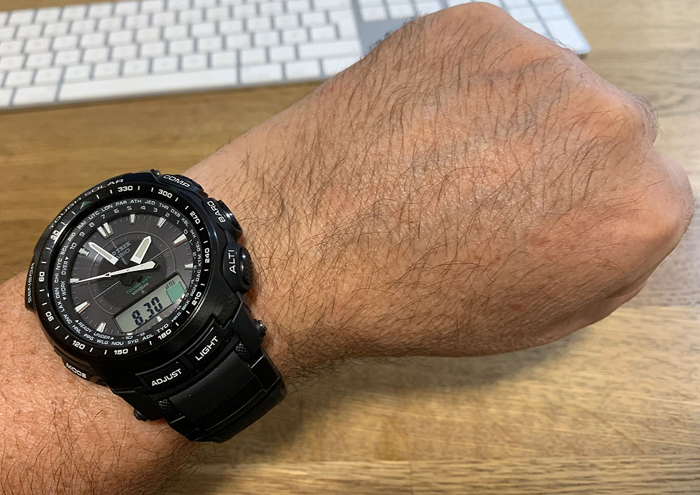 heute zum Arbeitseinsatz die nahezu unverwüstliche Casio ProTrek PRW-5100, die ausser Samstags Brötchen holen, eigentlich alles kann.....