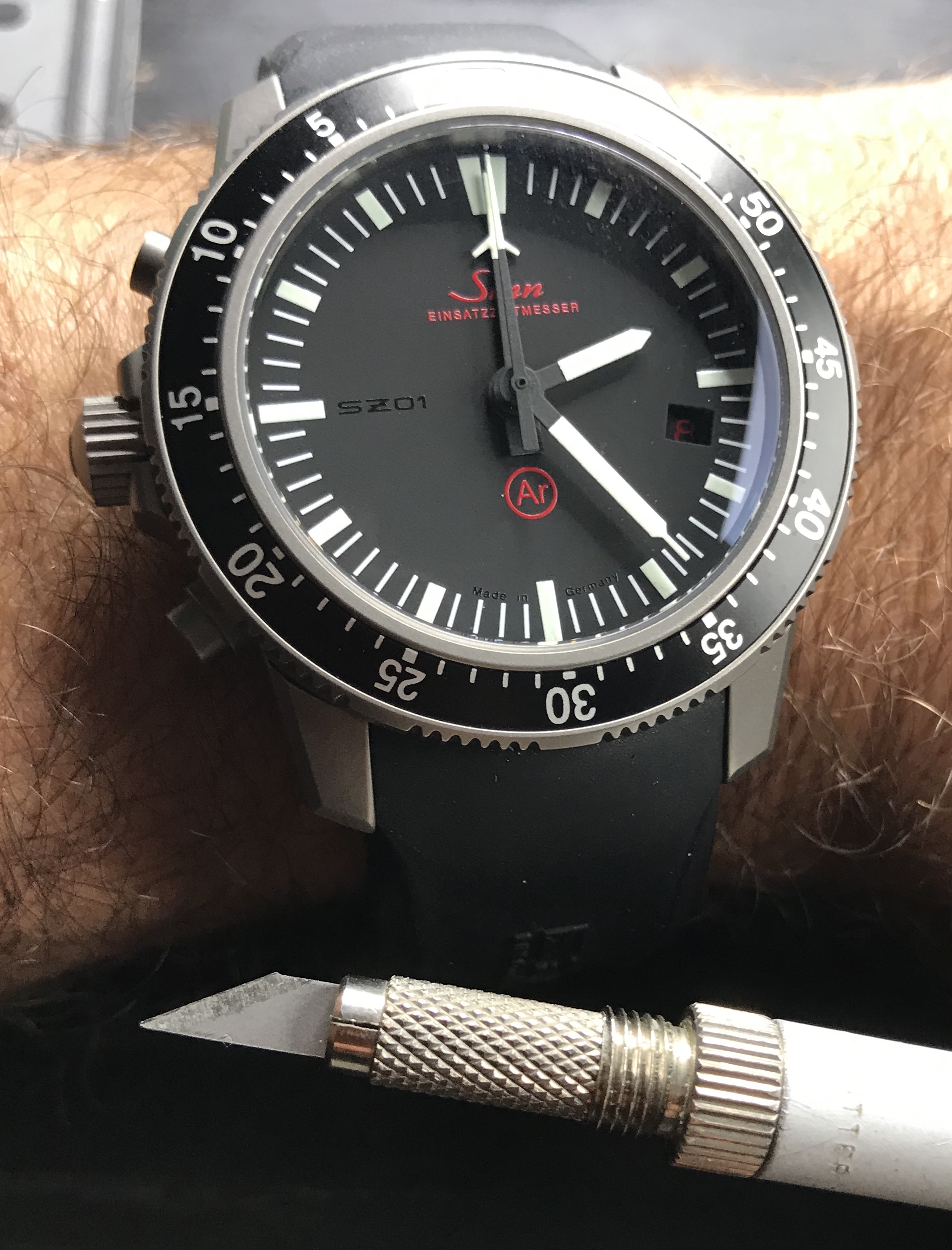 • Da ich nun noch keine Sinn Uhr habe und möglicherweise noch ein wenig auf ein Modell warten muss, was meine Anforderungen erfüllt, hier mal ein Bild von meiner Uhr, am passenden Kautschukband. Zugegeben nicht alltagstauglich und leider noch keine Faltschliesse- man arbeitet aber dran :D