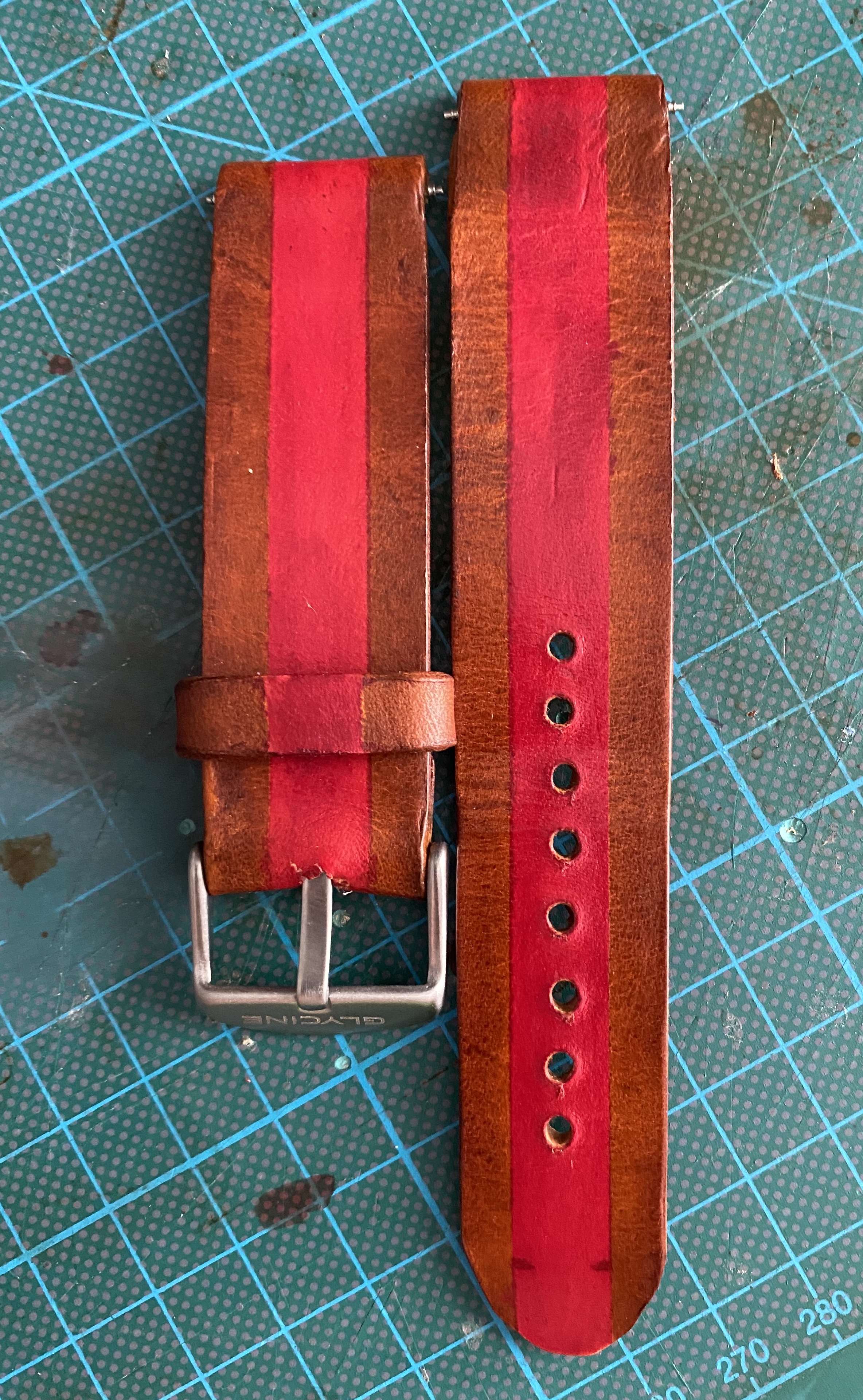 Bisher ist die Tragezeit noch zu gering, um etwas Genaues sagen zu können. Das Leder ist aber nach dem Versiegeln recht spröde und könnte evtl. an der Dorn-Position „brechen“. Mal sehen, was der Praxis-Test sagt ...Den Keeper und die Schließe habe ich heute Morgen noch ausgetauscht.