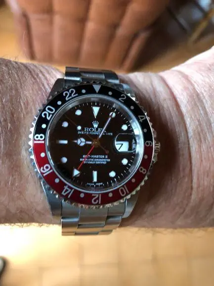 Rolex GMT-Master II Stahl mit Stahlband, rot-schwarzer Luenette, schwarzem Zifferblatt, Saphirglas,