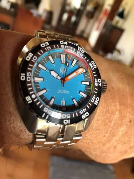 The NTH DevilRay Turquoise Date is a superb diving watch. The technical aspects are very impressive: double domed sapphire glass with an AR coating, 500m (50ATM) water resistance, bright X1 Superluminova, 120 click uni-directional bezel with a DLC insert and of course a great Swiss Made automatic movement, the Swiss Tech Prod. cal. STP1-11 auto (28800bph). The watch is very comfortable with the 'just right' 43mm diameter (46mm lug to lug) but also due to the great clasp with divers extension.