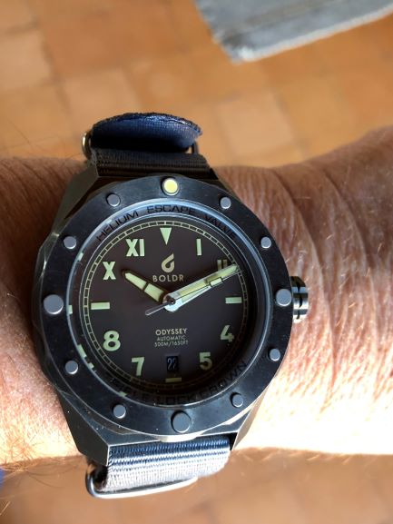 The BOLDR Odyssey Cali Umber is a great diving watch with a powerful, original design. It has a lot of great features such as 500m water resistance, a Helium Escape Valve, domed sapphire glass with an AR coating, and a 120-click unidirectional bezel. Under the hood you'll find a Swiss Made Sellita SW200-1 movement.