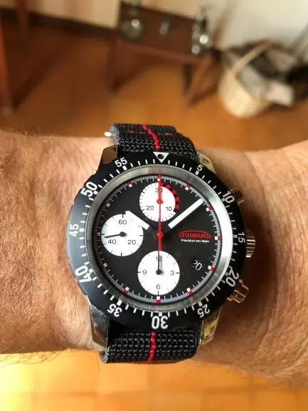 Weight without strap: 86.5 gramsOur HS100 model pays homage to the late 1960s/early 1970s and a pilot chronograph from that era designed by Helmut Sinn. We have carefully updated that model and released it in a limited edition of 100 items. With a date display at 4 o'clock and an automatic movement, the HS100 is state-of-the-art. The watch still boasts the little white subdials with the characteristic colour of the hands and the striking red and white zebra design of the minute scale. The face is protected by a domed, anti-reflecting sapphire crystal. The limited edition number XXX of 100, as well as the model designation, are engraved between the lugs. This watch is also made by us in Germany and, to distinguish it from the old models which were originally produced in Switzerland, Guinand Frankfurt am Main is engraved on its face.