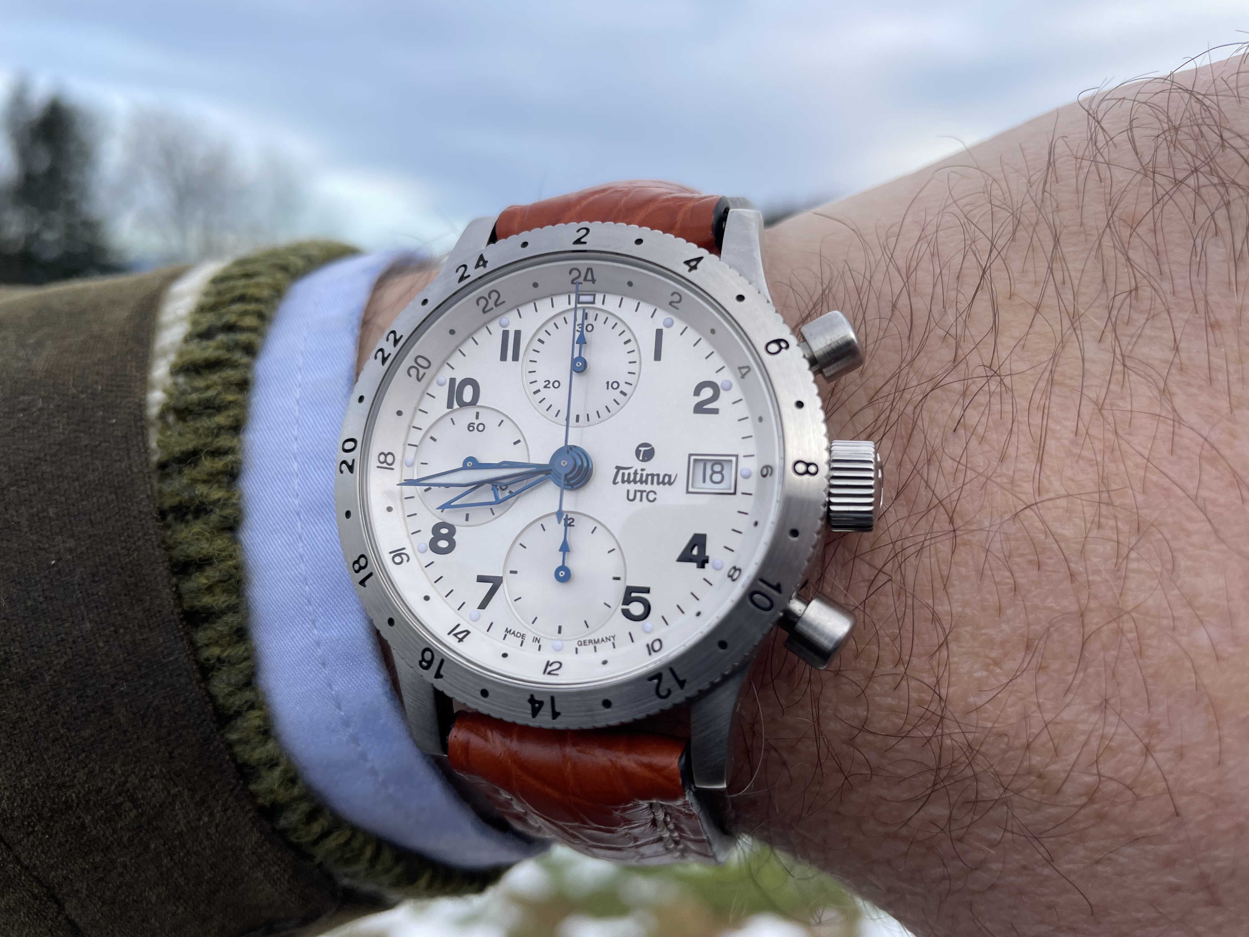 Sinn 155 Flyback auf Basis eines Leonidas Bundeswehr Chronographen mit Valjoux 222. Die Leonidas ist nur 255 Mal an die Bundeswehr ausgeliefert worden und wohl nur in homöopathischen Dosen von Helmut aufgearbeitet und verkauft worden. Freue mich!!
