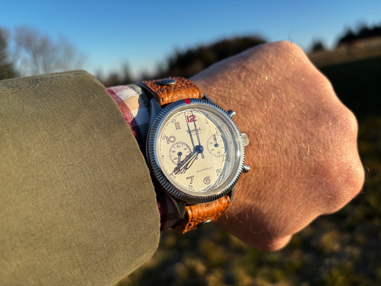 In addition to the brown leather strap with stainless steel buckle, this watch comes with a red/white/blue/black NATO-style nylon strap, both with matching hardware. A spring-bar removal tool is also included for easy strap swapping.