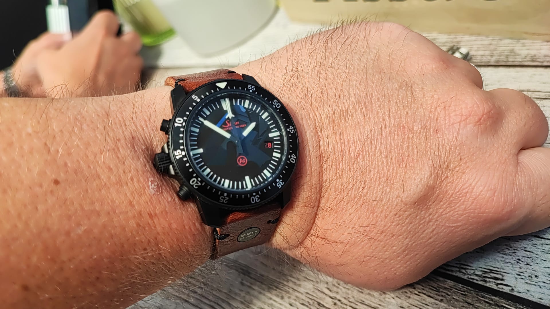 The 316L stainless steel case is coated with titanium carbide PVD and bead-blasted for added durability and finish. With dimensions of 42.5 mm wide (excluding crown guard), 47 mm lug-to-lug, and 13.1 mm thick, this watch fits comfortably on any wrist.