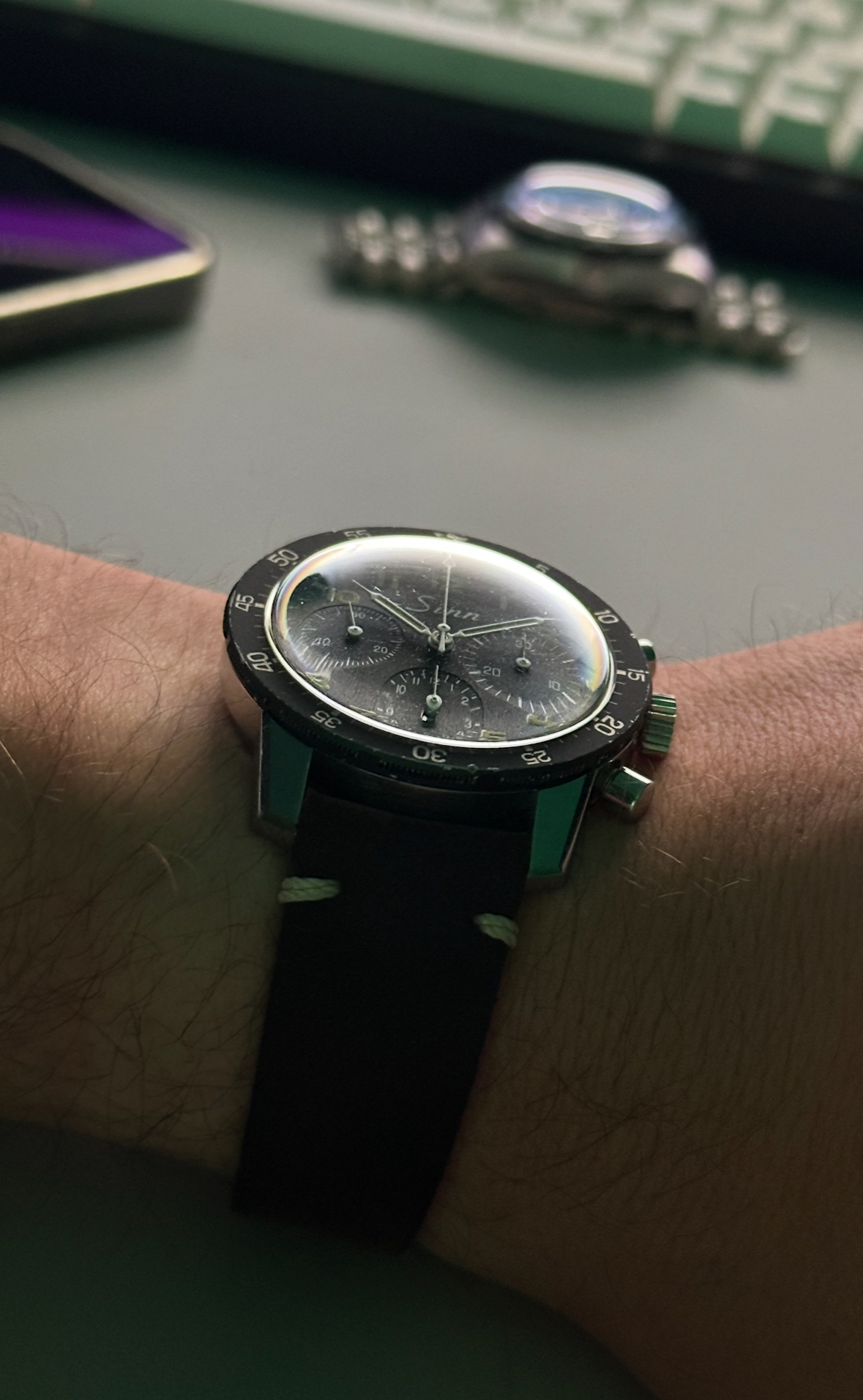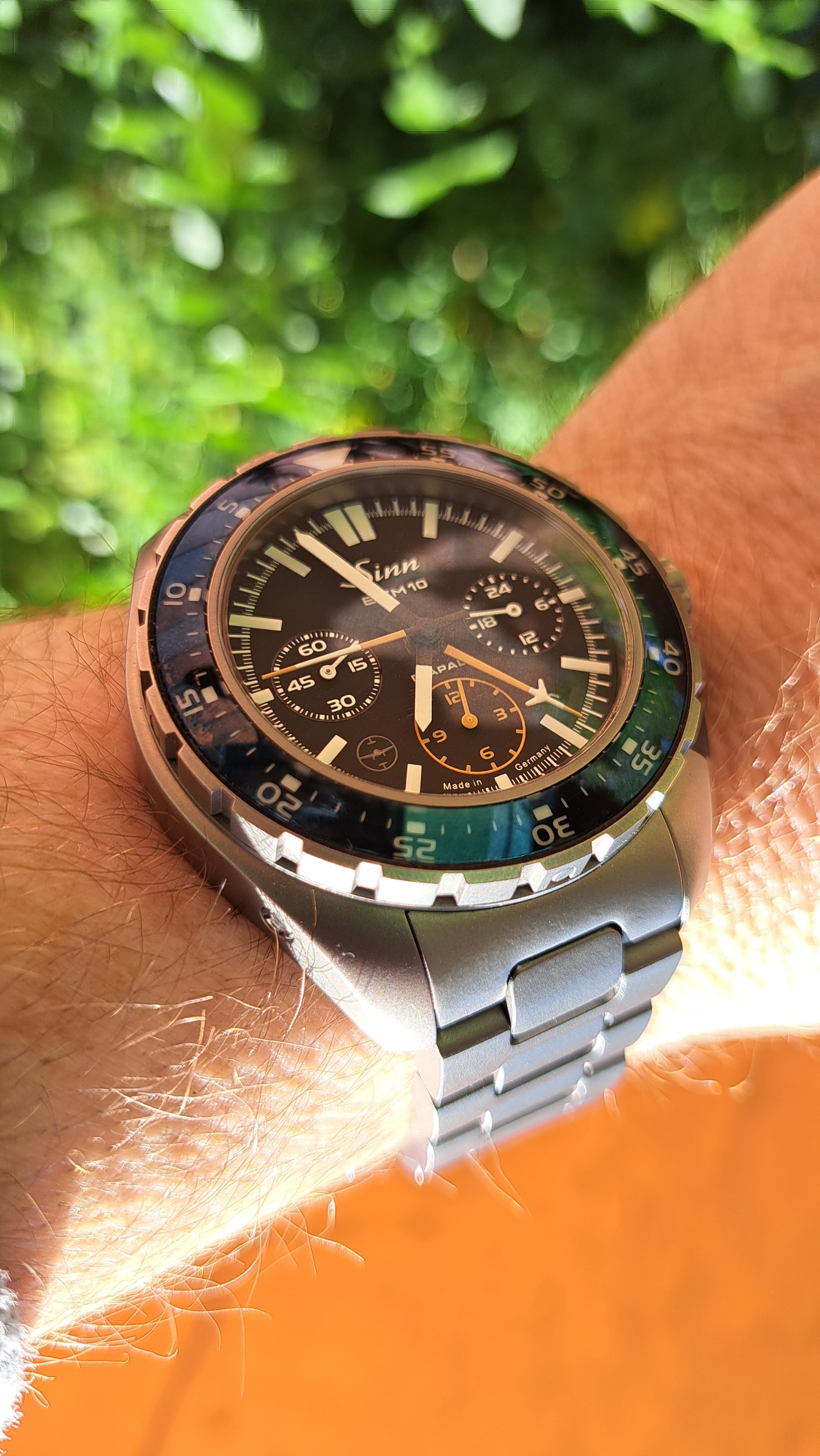 heute mal ne Uhr mit einem tollen Manufakturwerk, Flyback, Titangehäuse, Carbonlünette, Schnellwechselbandsystem und Glasboden