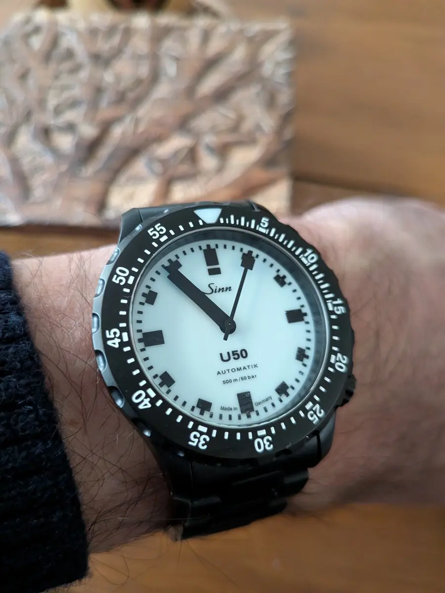Bei der “Standard” 156.1 ist der rote Stoppminutenzeiger in ruhender Position über dem Sinn Logo nicht so störend wie bei der 156.1 E. Durch die andere Farbe bleibt das Logo klarer ersichtlich, bzw erkennbar. Bei der 156.1 E zerstört der weiße Zeiger über dem weißen Sinn Logo das Erscheinungsbild. Ich vermute ja fast, das beim Sondermodel niemand wirklich über die Zeigerposition nachgedacht hat, weil beim Serienmodel passts ja, da hats dann geheißen der Zeiger wird weiß und fertig….