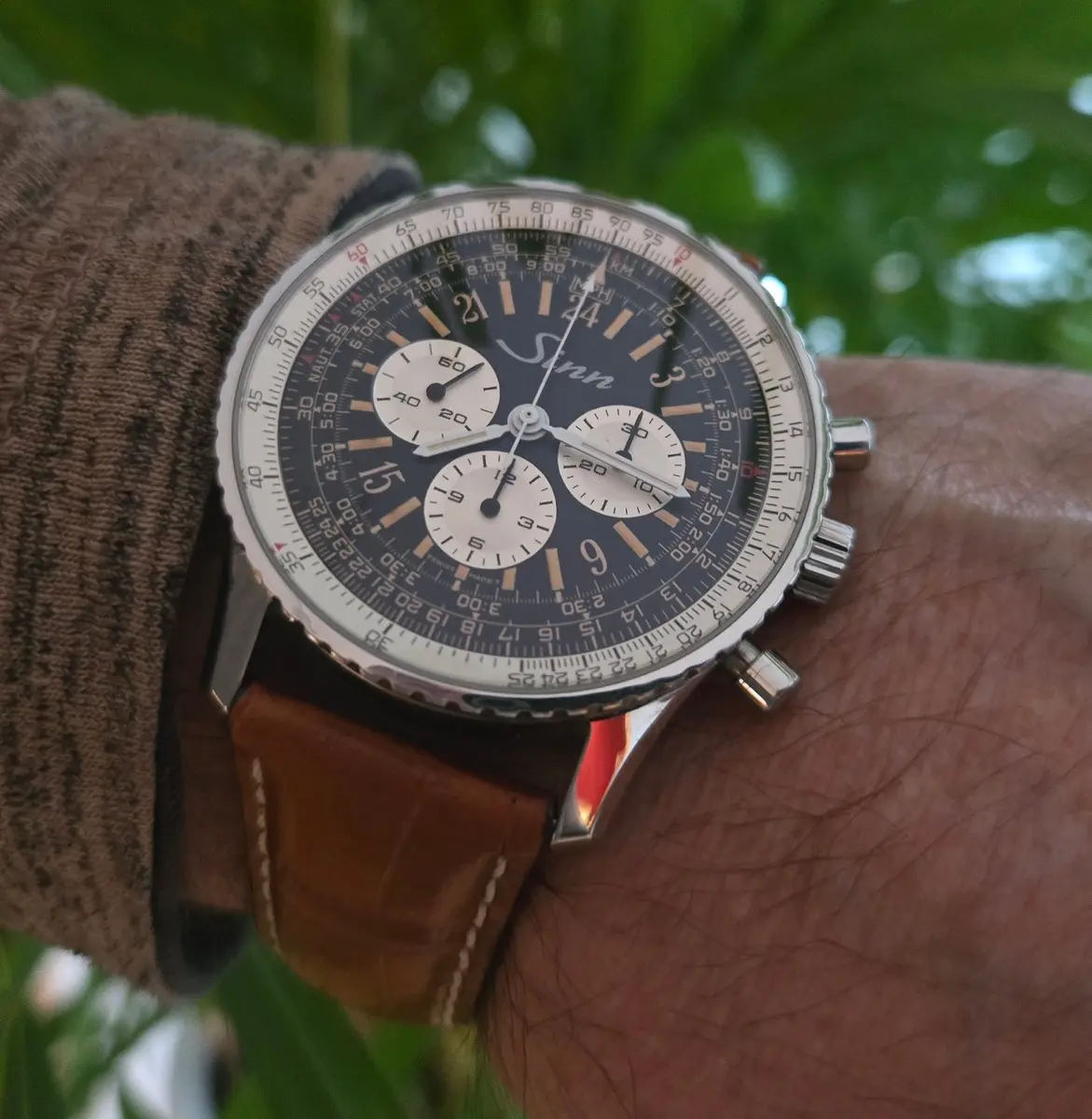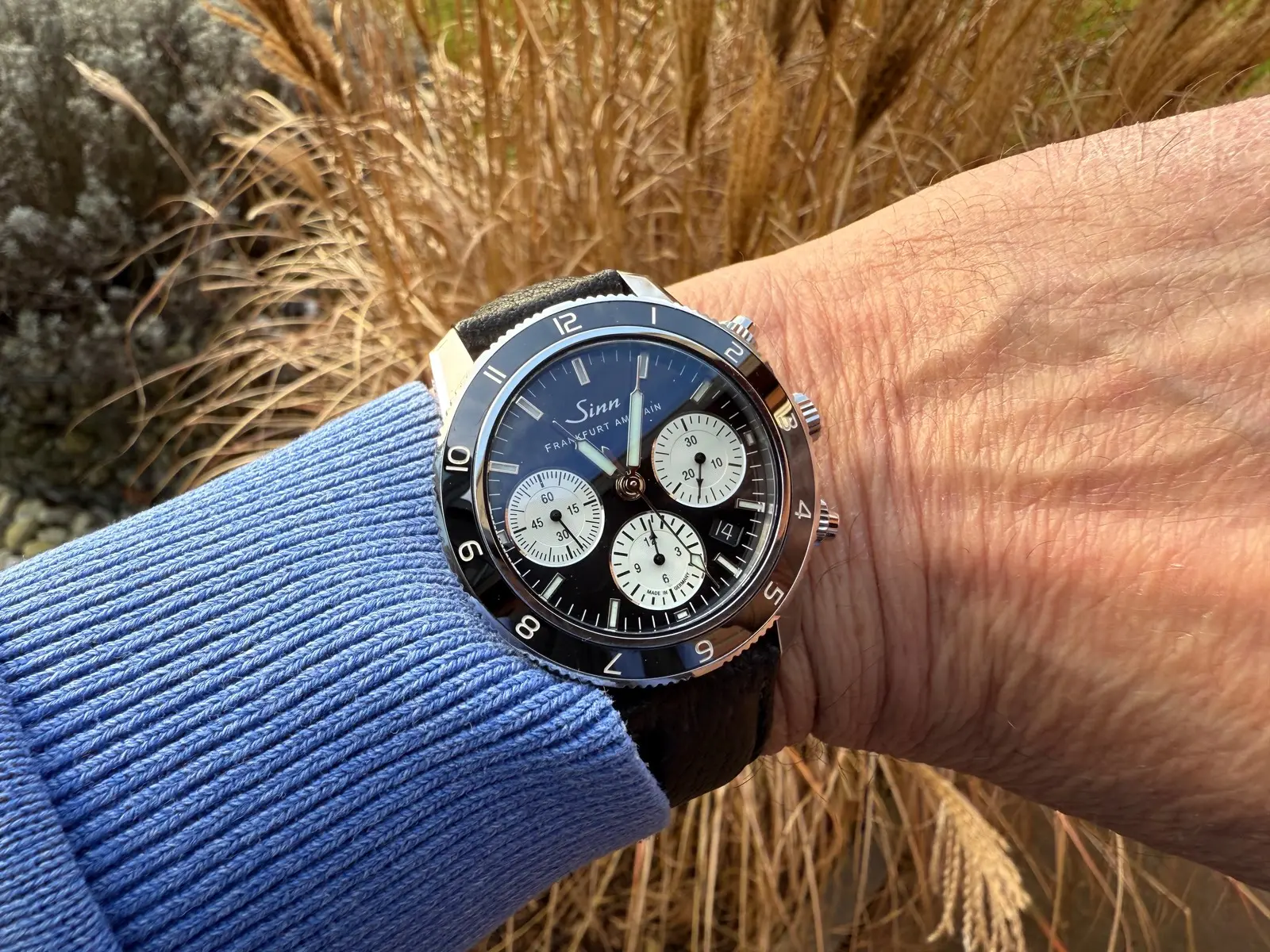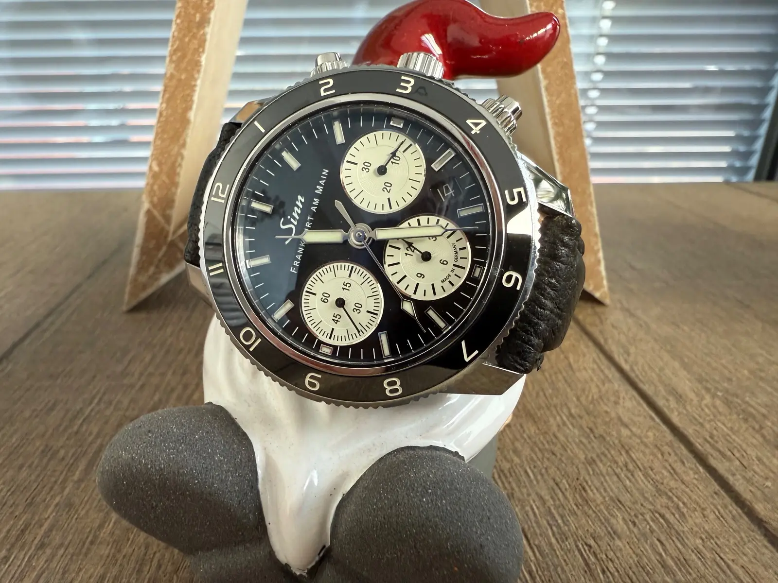 Bei der “Standard” 156.1 ist der rote Stoppminutenzeiger in ruhender Position über dem Sinn Logo nicht so störend wie bei der 156.1 E. Durch die andere Farbe bleibt das Logo klarer ersichtlich, bzw erkennbar. Bei der 156.1 E zerstört der weiße Zeiger über dem weißen Sinn Logo das Erscheinungsbild. Ich vermute ja fast, das beim Sondermodel niemand wirklich über die Zeigerposition nachgedacht hat, weil beim Serienmodel passts ja, da hats dann geheißen der Zeiger wird weiß und fertig….