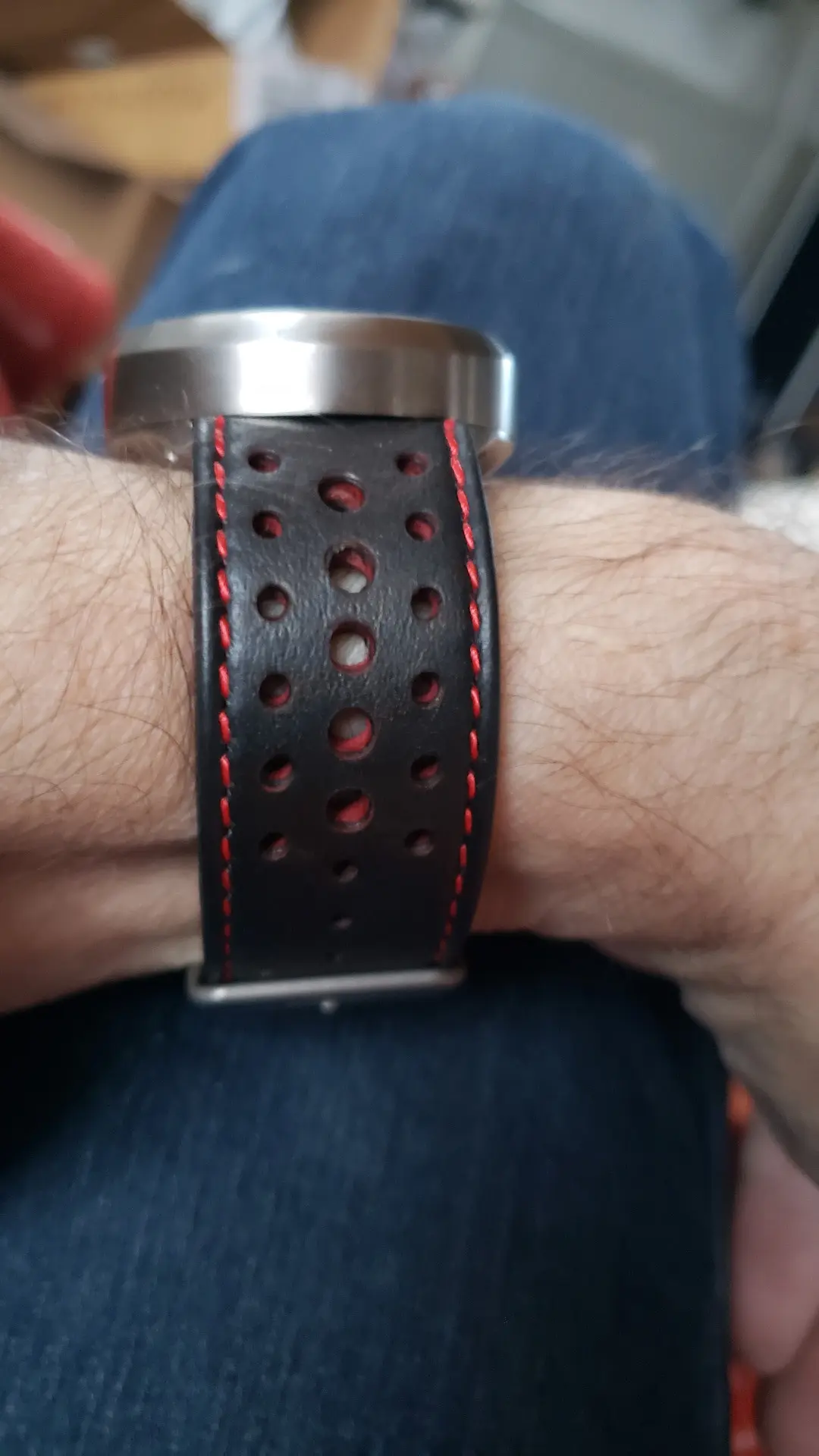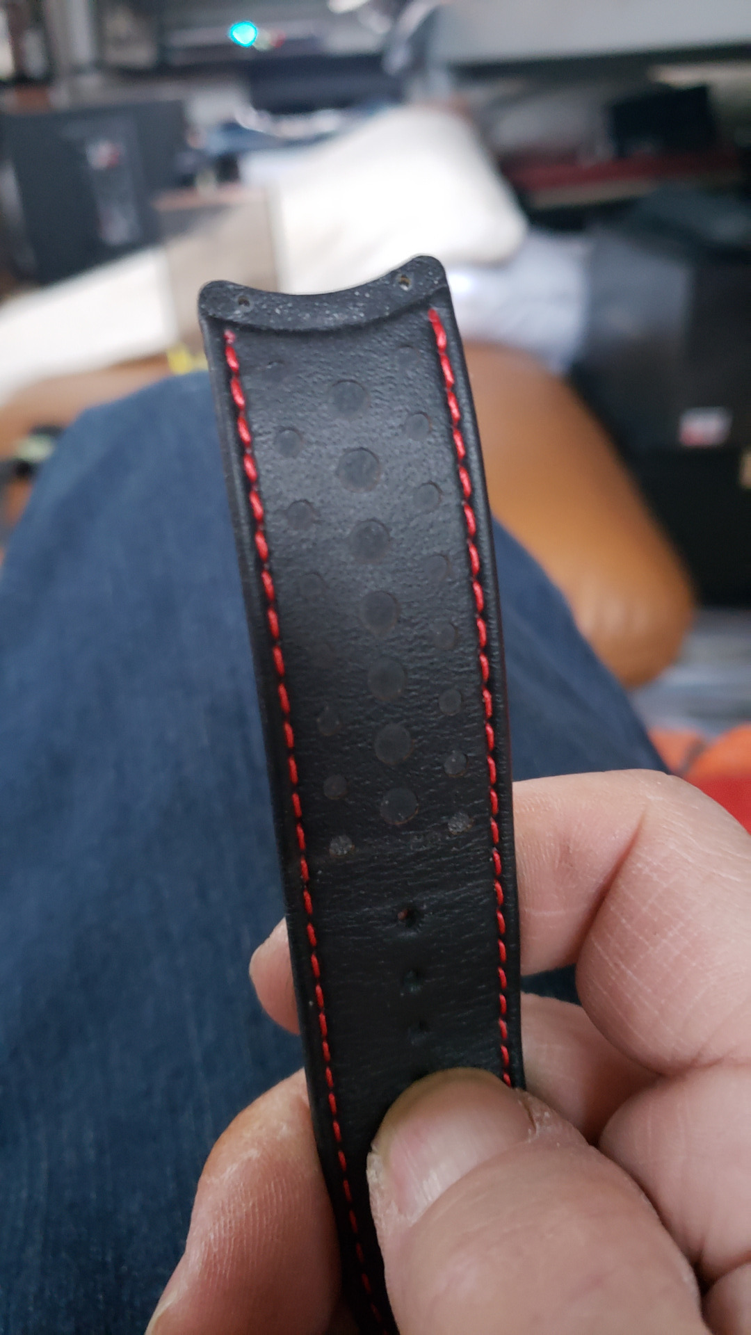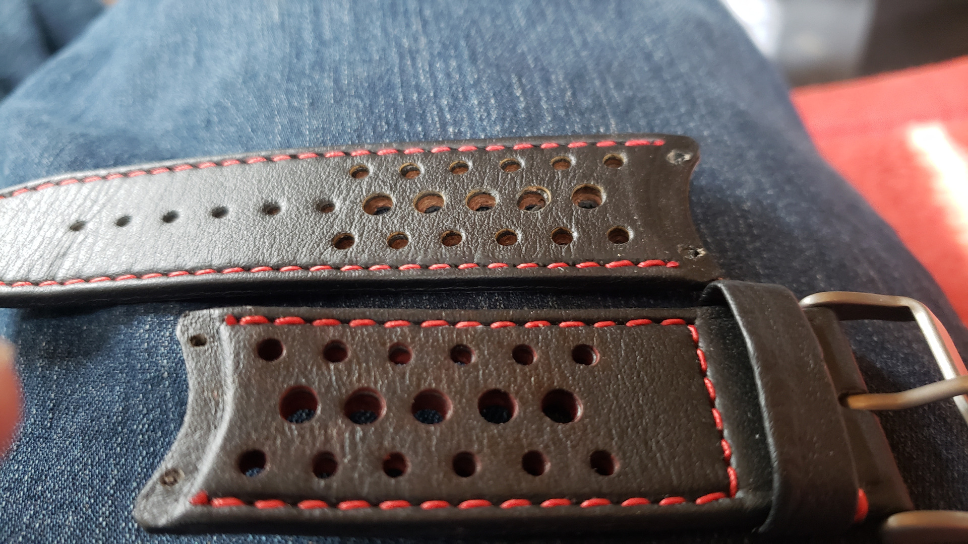 Das originale Band in L blieb latürnisch unberührt, modifiziert wurde ein aus der Bucht gefischtes neues in S - puhhh : Passt auf dem vorletzte Loch.