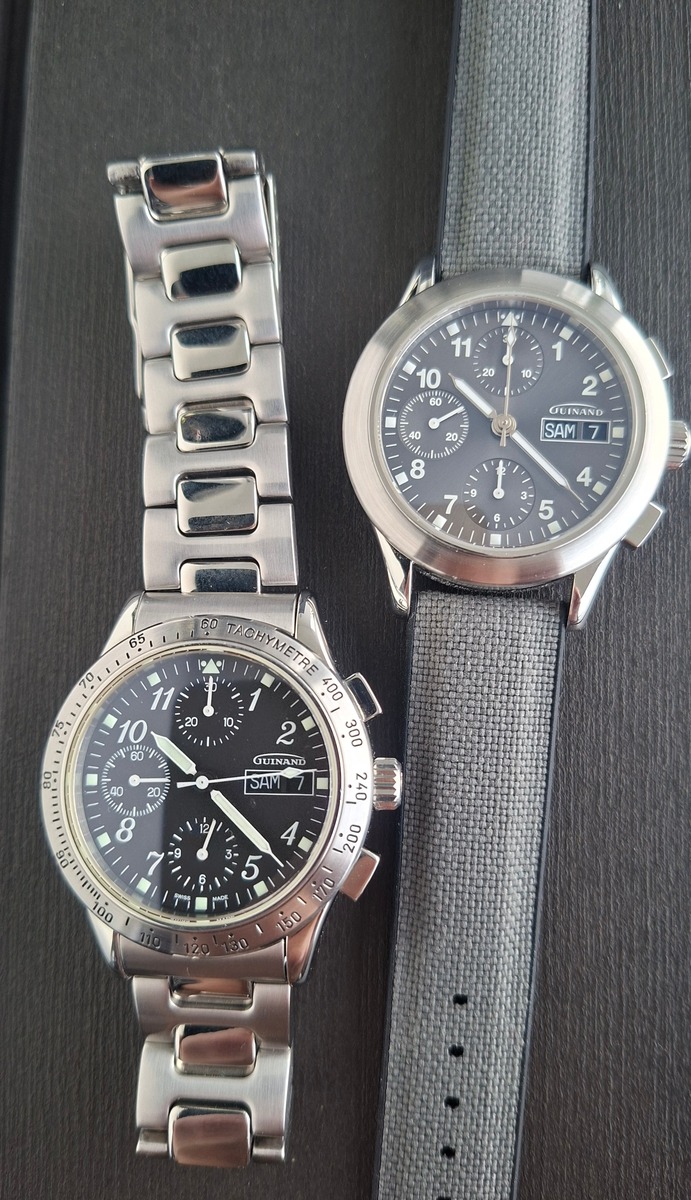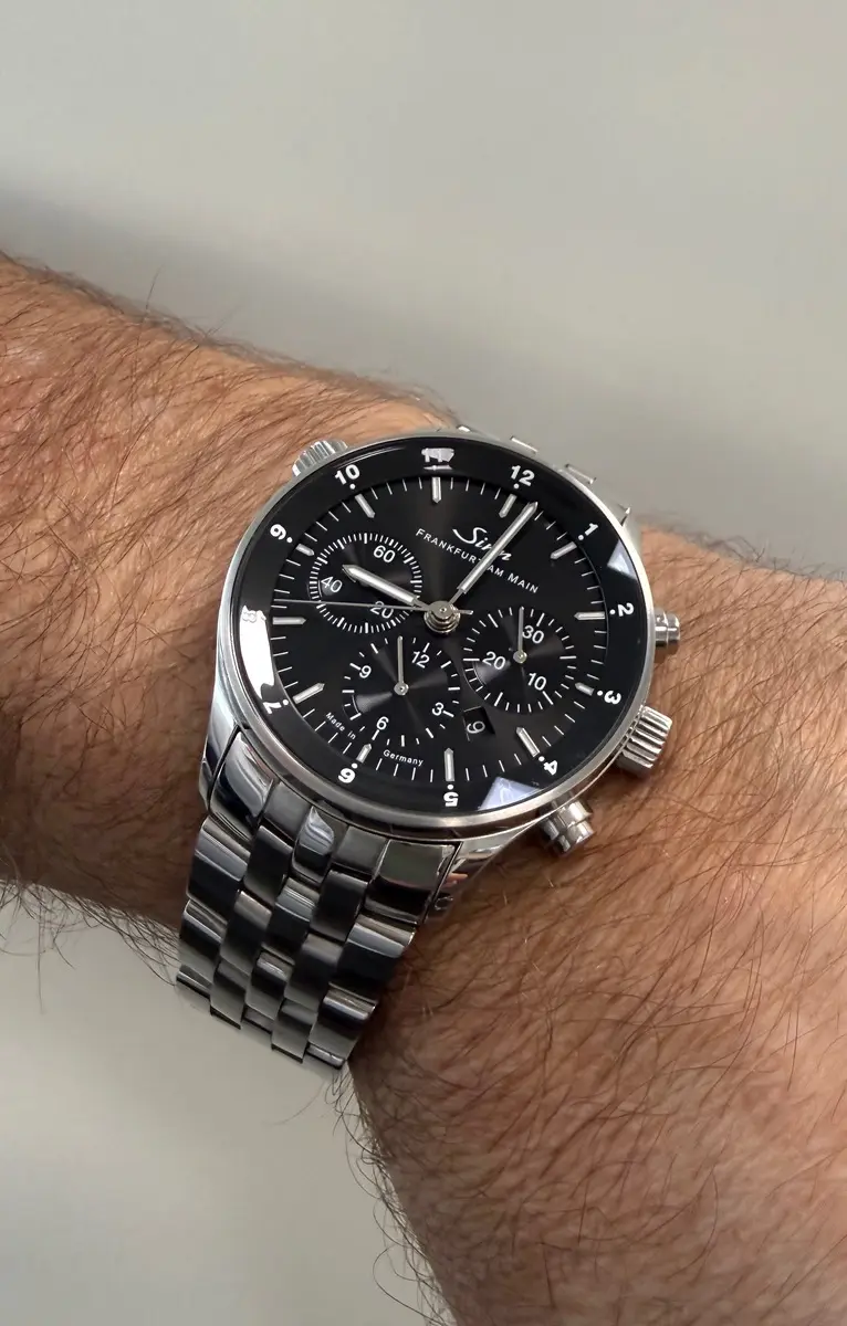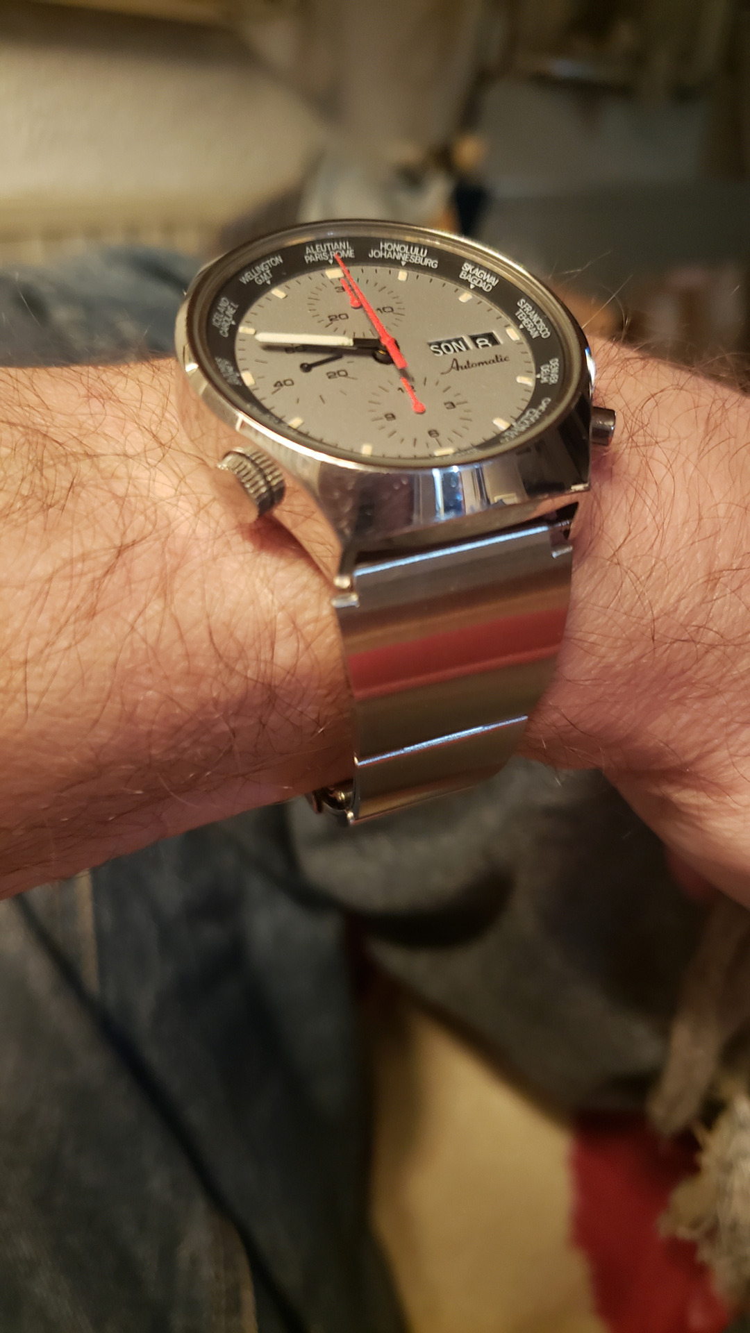 Nach 10 Jahren war ich damit mal beim Uhrmacher - altes original ETA ( aus nur ETA-Zeiten ) 7750 drin. Nach Werksrevision bei Robin Israel läuft sie echt perfekt. Vor drei Tagen noch ein altes Metallband aus der Bucht gefischt - Geil 😋