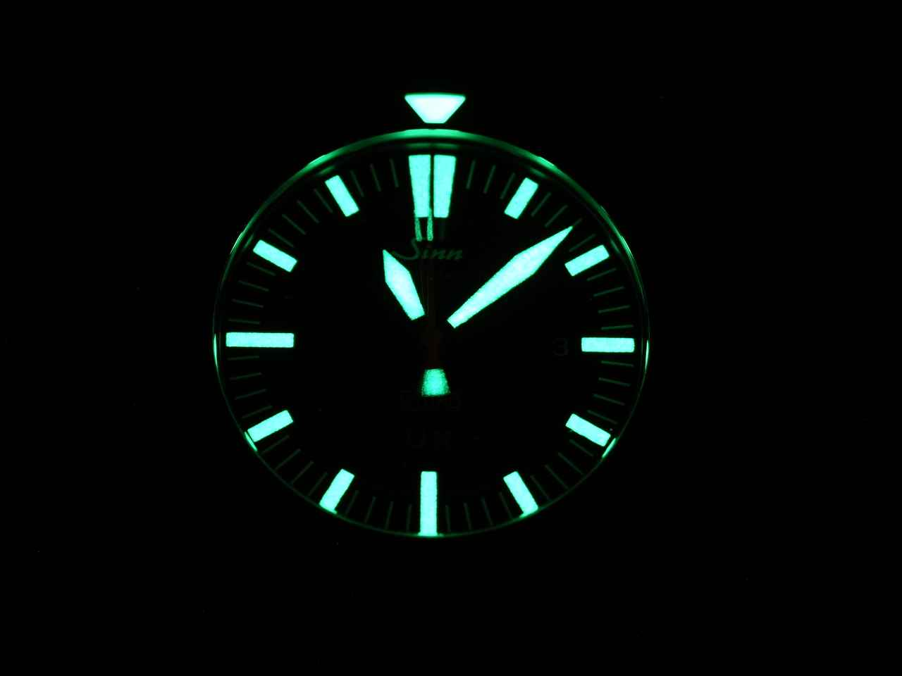 • Die tolle Ablesbarkeit verschwindet im Laufe der Nacht, da die Zeiger von den Indizes kaum oder gar nicht unterscheidbar sind! Also dann, wenn die Lume noch gut leuchtet, die Zeiger nur noch Flecken neben den Indizes sind, die nicht mehr unterschieden werden können. Die Zeiger sind zudem nur in der oberen Hälfte mit Leuchtmasse belegt.