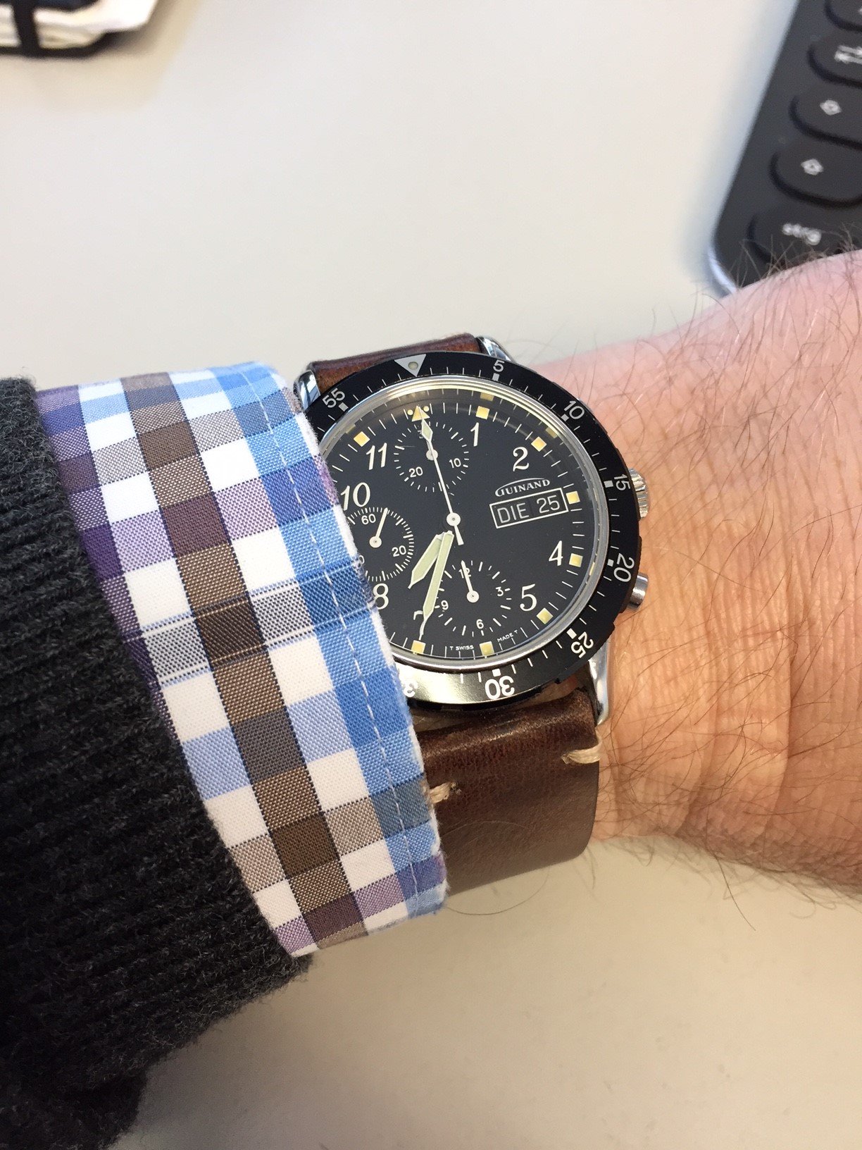 Wollte gestern zwar das Stahlband von den femininen 15 cm auf mein Kaliber aufweiten, hatte aber keinen passenden Schraubenzieher zur Hand. Finde aber das dunkelbraune Sattelvintage passt ebenfalls wie die Faust aufs Auge.
